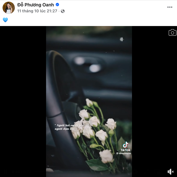 Trên mạng xã hội, trang cá nhân của Phương Oanh nhanh chóng trở thành tâm điểm chú ý. Tuy nhiên, thay vì chia sẻ, cập nhật hay phản hồi, nữ diễn viên chọn cách giữ im lặng tuyệt đối. Bài đăng gần nhất của cô là vào ngày 11/10 - chỉ ba ngày trước khi thông tin khởi tố được công bố với hình ảnh trái tim màu xanh dương cùng đoạn clip sử dụng ca khúc Ánh trăng nói hộ lòng tôi. Dòng trạng thái ngắn gọn, tưởng chừng chỉ là một chia sẻ cảm xúc đơn thuần, nay lại được cư dân mạng soi chiếu và bàn tán dưới nhiều góc độ khác nhau.