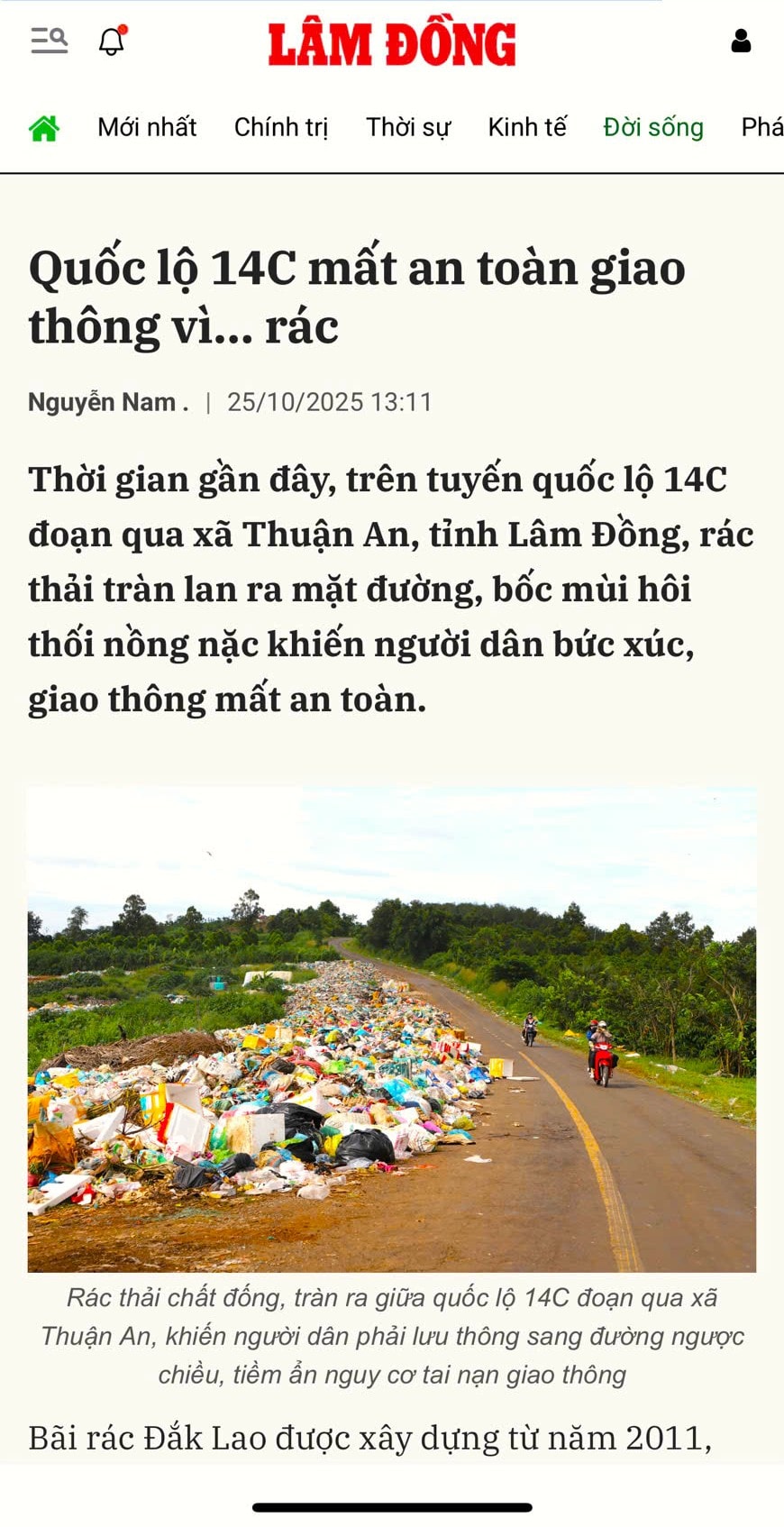 Báo Lâm Đồng đã có bài viết “Quốc lộ 14C mất an toàn giao thông vì… rác” đăng ngày 25/10/2025 phản ánh tình trạng rác thải tràn ra Quốc lộ 14C đoạn qua xã Thuận An