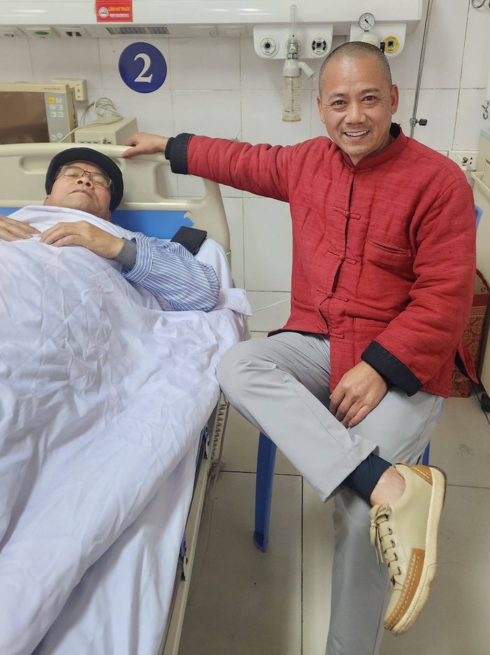 NSND Trần Nhượng đang được con trai chăm sóc tại bệnh viện. Ảnh: FBNV