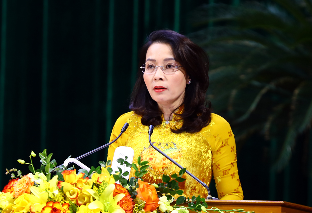Đồng chí Nguyễn Thị Hương, Phó Bí thư Thường trực Tỉnh ủy trình bày báo cáo tại hội nghị.