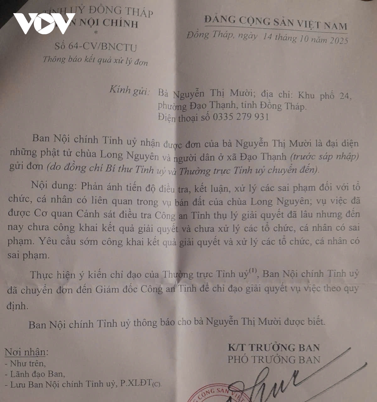 Văn bản của Ban Nội chính Tỉnh ủy Đồng Tháp trả lời thư của các hộ dân kiến nghị sớm xử lý sai phạm liên quan vụ bán đất chùa Long Nguyên