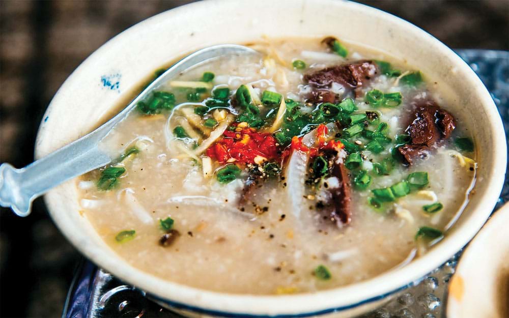 Là nhà văn nên ông tả rất chi tiết: “Cháo nấu nhừ, huyết cắt vuông thành từng miếng vừa vặn nhỏ để được nằm gọn trong lòng cái muỗng nhôm. Múc một muỗng vừa có cháo vừa có huyết đưa lên môi thổi cho bớt nóng trước khi cho vào miệng, mà nghe thơm phức làm chảy nước miếng. Còn giò cháo quẩy cho vào cháo, dù đã được cắt khoanh, nhưng vẫn giữ nguyên cái giòn của nó. Cái “béo” của giò cháo quẩy làm cho cái “bùi” của cháo càng thêm đậm đà, và cái “giòn” của giò cháo quẩy thì thật “ăn rơ” với cái mềm mềm cứng cứng của huyết. Lâu lâu, nhai nhằm một sợi gừng làm nồng lên trong miệng, ngon không chê được!”.