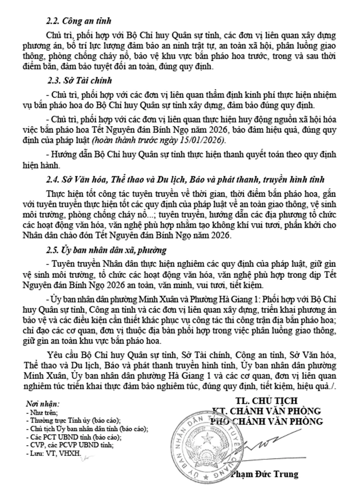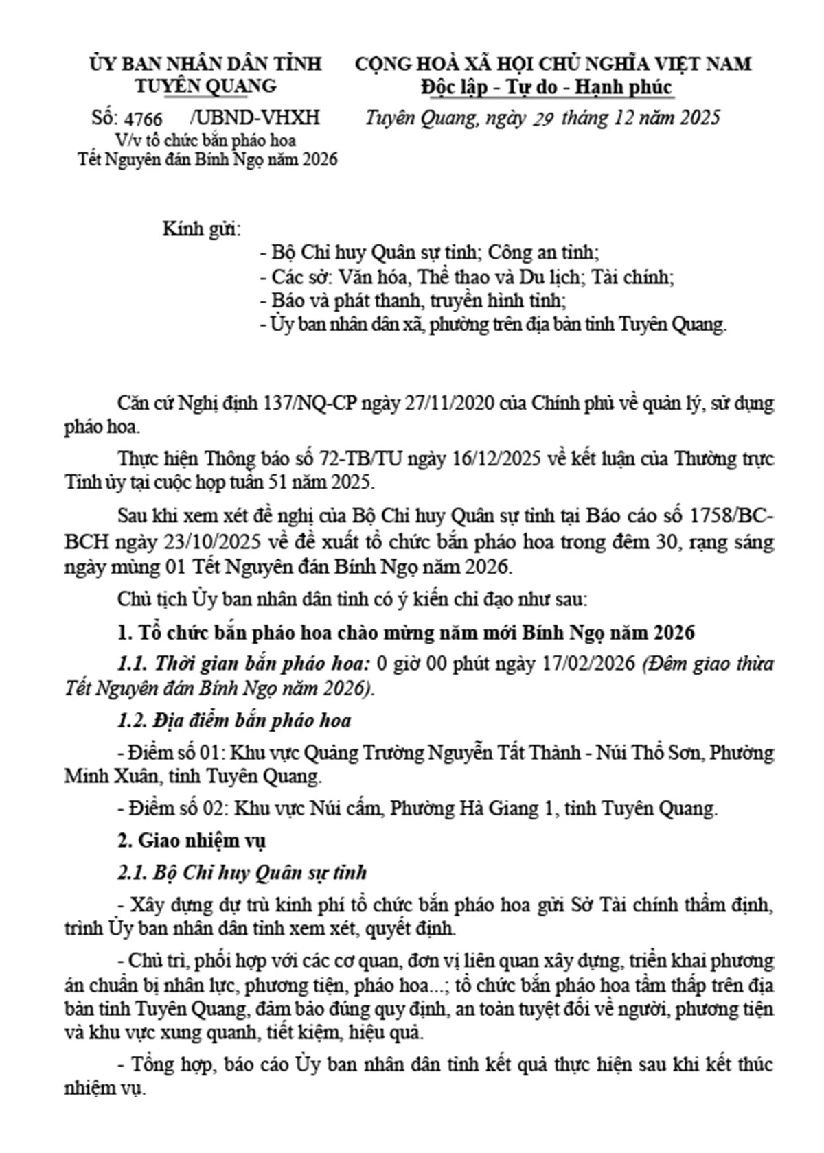 Ngày 29-12, UBND tỉnh ban hành Công văn số: 4766/UBND-VHXH về việc tổ chức bắn pháo hoa chào mừng năm mới Bính Ngọ năm 2026.