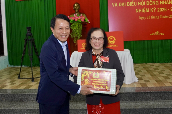 Bộ trưởng Lương Tam Quang trao quà tặng bà Đinh Thị Búp, Bí thư Chi bộ 8 Phú Nhuận, Tổ trưởng Tổ bầu cử số 11, phường Thuận Hóa, TP Huế.