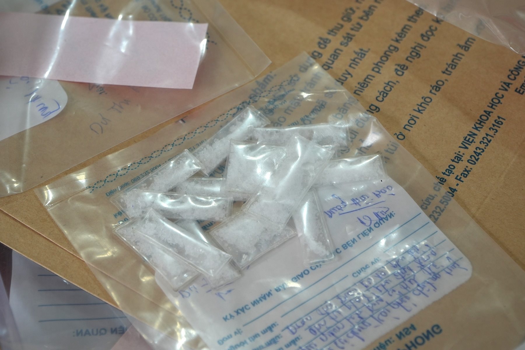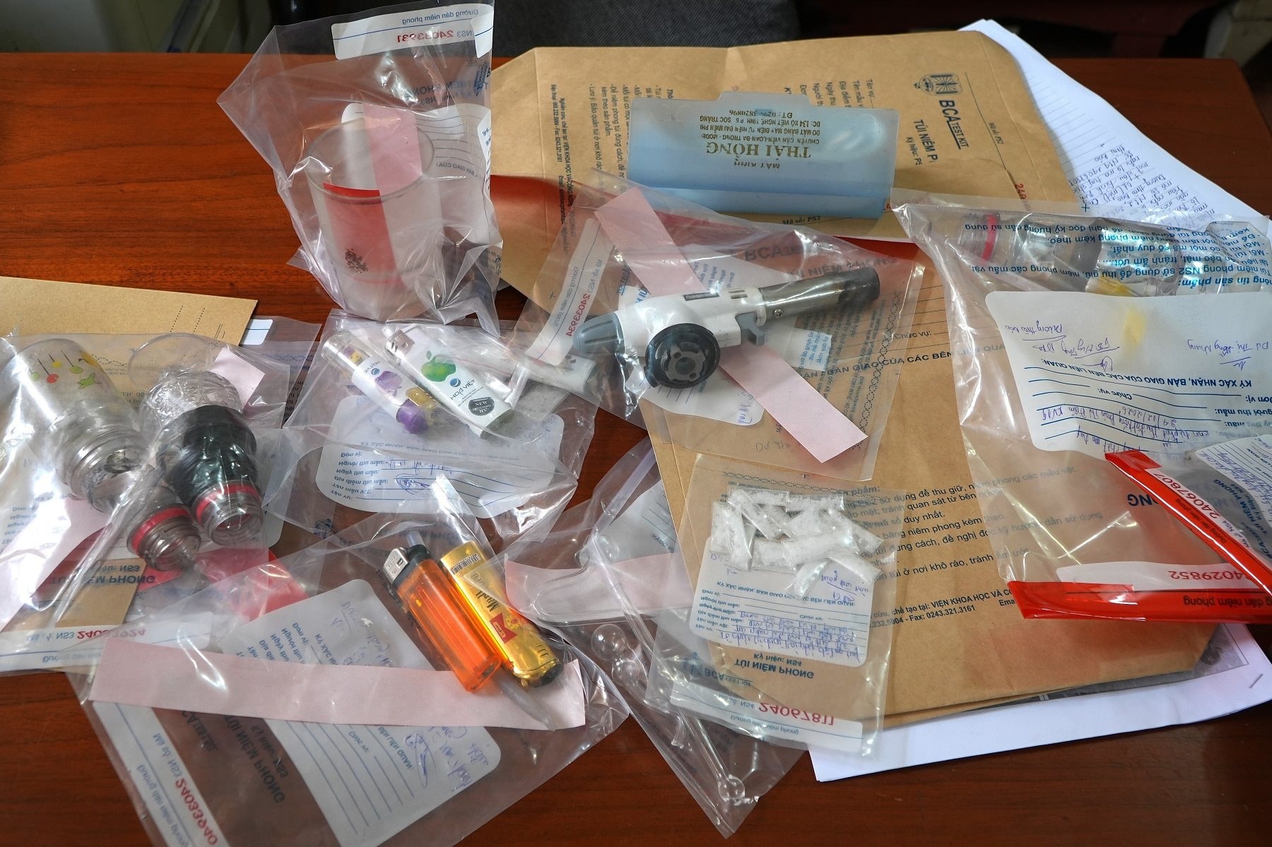 Lực lượng công an đã tạm giữ các tang vật gồm: 14 gói nilon được hàn kín hai đầu bên trong có chứa tinh thể rắn màu trắng (nghi là ma túy), dụng cụ dùng để sử dụng chất ma túy cùng một số tang vật khác có liên quan.