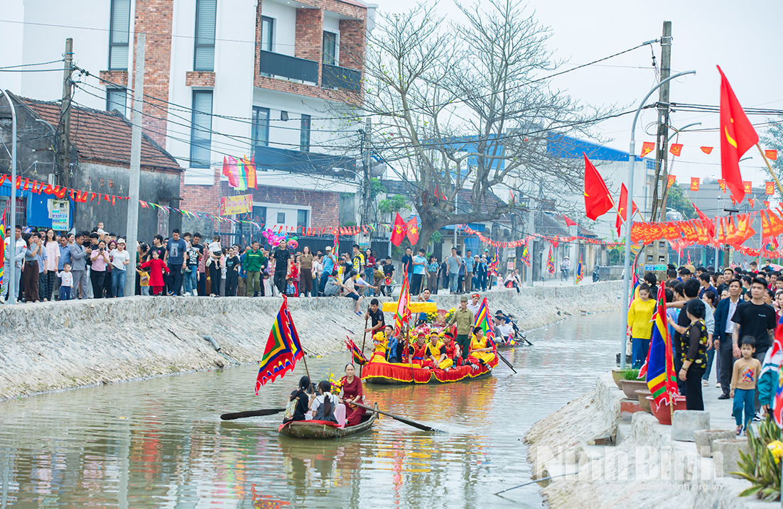 Đặc biệt, quá trình di chuyển rước kiệu được thực hiện nghiêm cẩn theo phương thức “đi thủy, về bộ” quanh thôn. Hàng trăm người dân tham gia đoàn rước trong trang phục truyền thống, cờ lọng chỉnh tề.