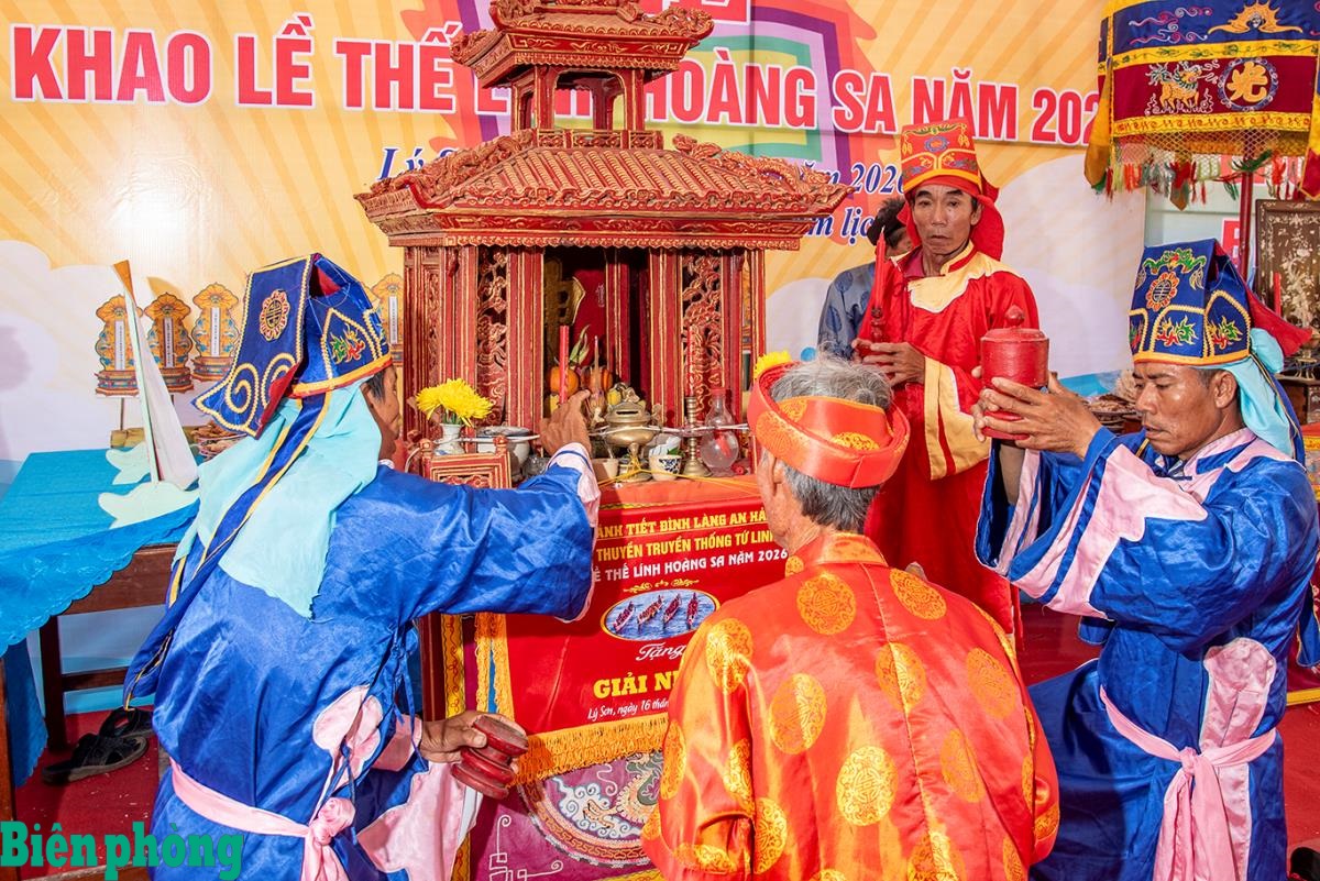 Nghi lễ dâng rượu cho các vị thần và lính Hoàng Sa được thực hiện trân trọng bằng những chiếc cốc cổ xưa. Ảnh: Lê Văn Chương