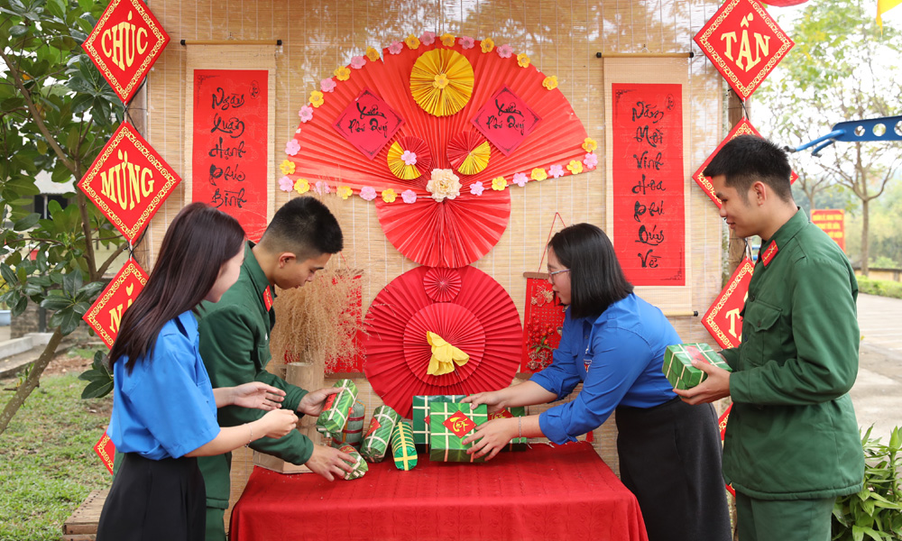 Bộ đội Trung đoàn 831 và đoàn viên thanh niên trang trí không gian đón Tết tại đơn vị.