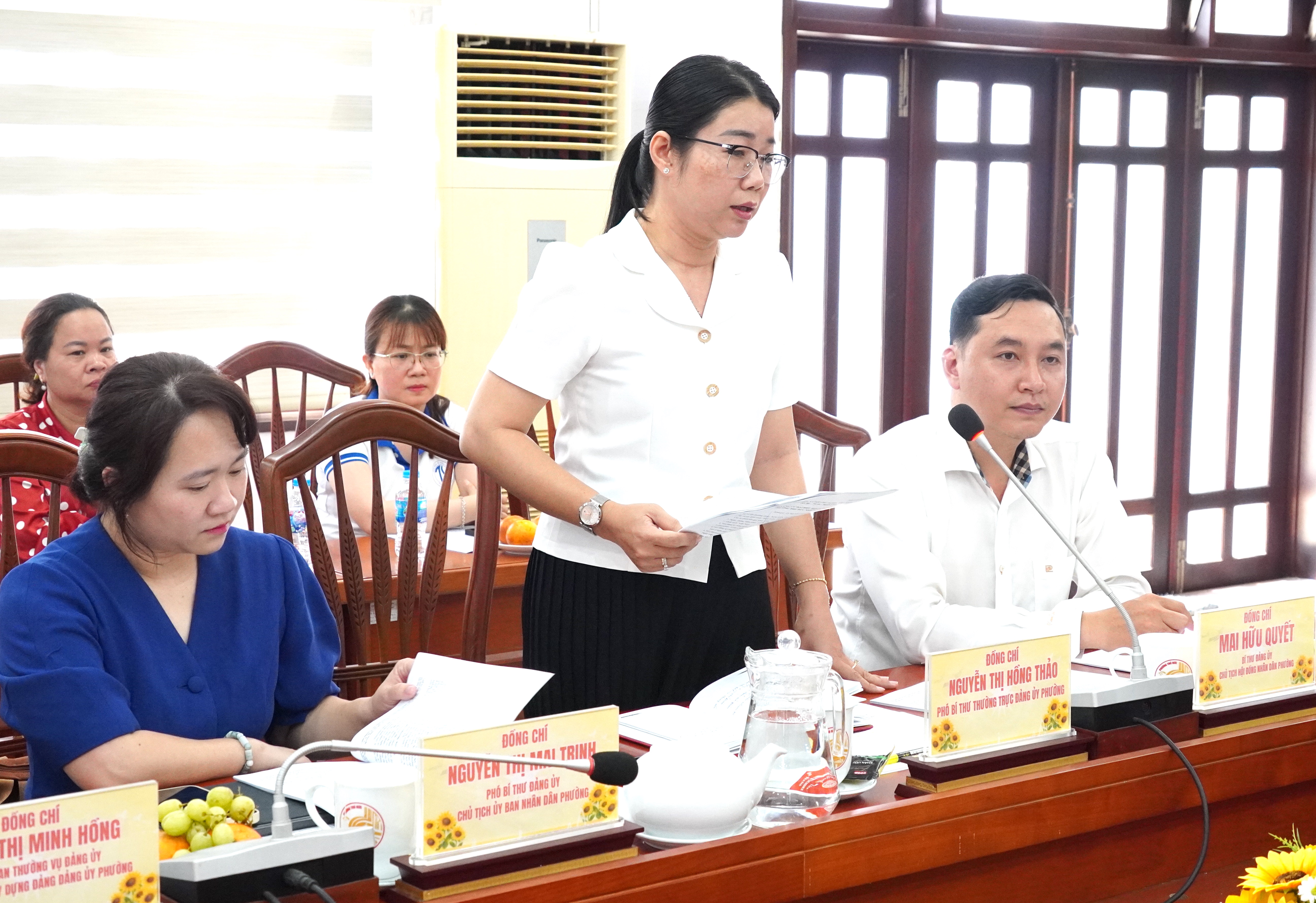 Phó Bí thư Thường trực Đảng ủy phường Thủ Đức Nguyễn Thị Hồng Thảo báo cáo với đoàn công tác