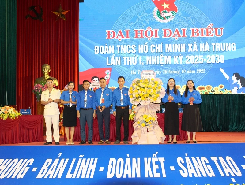 Các đồng chí lãnh đạo Tinh Đoàn, xã Hà Trung tặng hoa chúc mừng Ban Chấp hành Đoàn xã Hà Trung, nhiệm kỳ 2025-2030.
