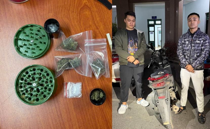 Kiểm tra đối tượng Nguyễn Huy Hoàng (SN 1995; trú tại Thanh Xuân, Hà Nội), tổ công tác phát hiện 3 gói nilon chứa thảo mộc khô và 1 túi nilon chứa tinh thể màu trắng. Hoàng khai nhận số thảo mộc khô là ma túy “cỏ”, còn tinh thể màu trắng là ma túy “đá”. Toàn bộ số ma túy này được các đối tượng khai mang theo để sử dụng.