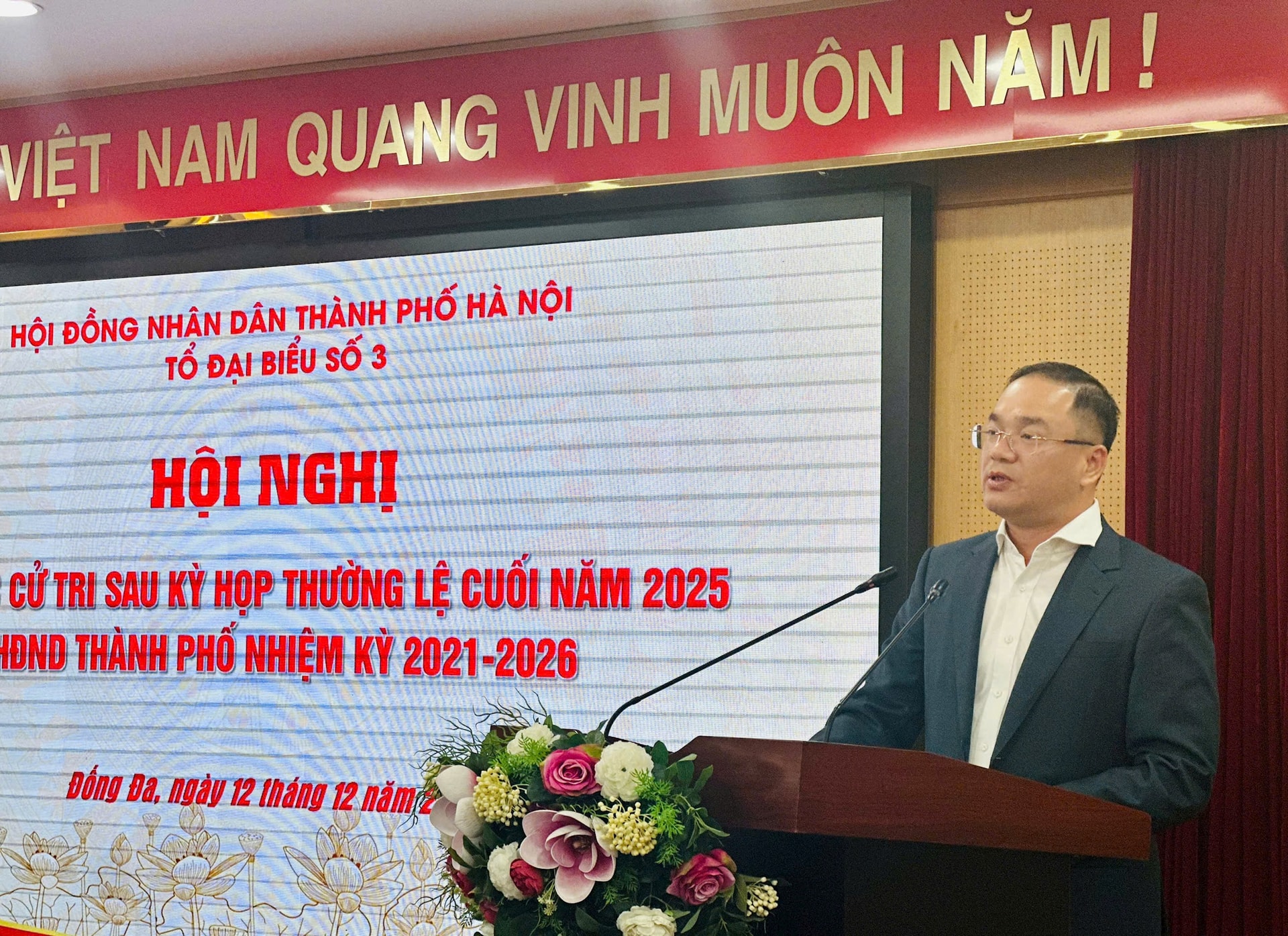 Tại hội nghị, thay mặt Tổ đại biểu số 3 HĐND thành phố Hà Nội, Bí thư Đảng ủy, Chủ tịch HĐND phường Đống Đa Nguyễn Ngọc Việt báo cáo với cử tri về kết quả kỳ họp thứ 28 (kỳ họp thường lệ cuối năm 2025) HĐND thành phố. Kỳ họp đã xem xét 21 báo cáo và thông qua 50 nghị quyết với tỷ lệ nhất trí cao. Các nghị quyết này là cơ sở pháp lý quan trọng nhằm thúc đẩy phát triển kinh tế - xã hội, bảo đảm an ninh quốc phòng, và giải quyết các vấn đề dân sinh, bức xúc của thành phố.