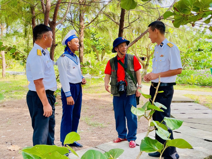 Nhà báo trò chuyện với cán bộ, chiến sĩ trên Đảo Sinh Tồn.