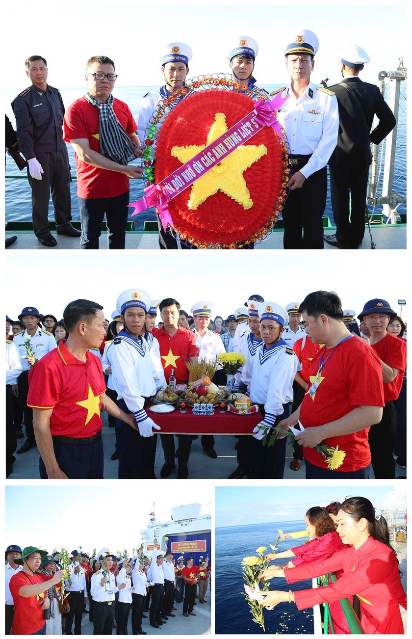 Lễ tưởng niệm các anh hùng liệt sĩ được tổ chức trang nghiêm giữa mênh mang trùng dương. Trong khói hương trầm, vòng hoa, hạc giấy thành kính lần lượt được thả xuống biển. Sóng không cuộn mạnh, chỉ nhấp nhô chậm rãi, như giữ lại những dấu lặng cần thiết cho một khoảnh khắc thiêng liêng.