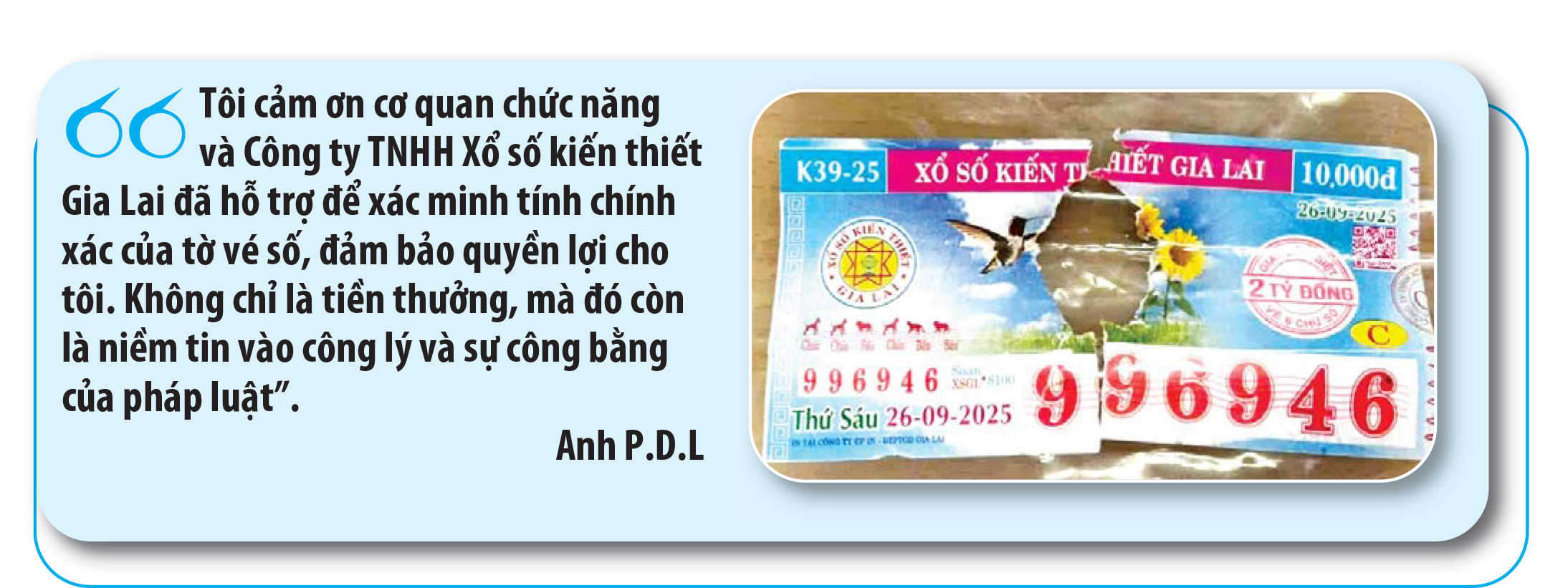 Căn cứ vào kết quả giám định kỹ thuật khoa học, ngày 23/10, Công ty TNHH Xổ số kiến thiết Gia Lai đã chính thức trả thưởng cho anh L, chủ nhân của tờ vé trúng giải đặc biệt kỳ K39-25 trị giá 2 tỷ đồng. Sau khi trừ thuế, anh L nhận được hơn 1,8 tỷ đồng.
