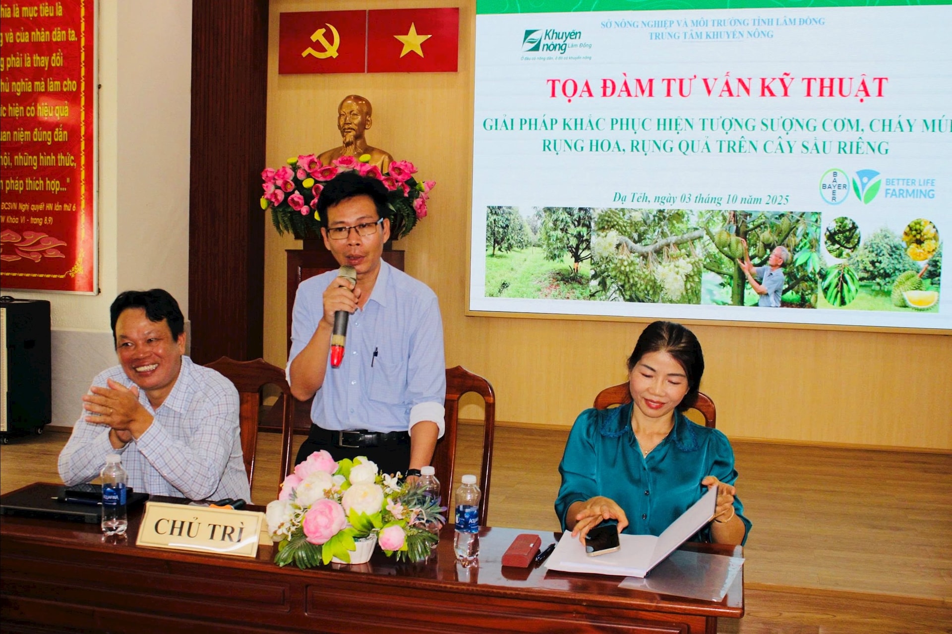 Phát biểu khai mạc tọa đàm, ông Nguyễn Đức Thiên – Phó Giám đốc Trung tâm Khuyến nông tỉnh Lâm Đồng cho biết: Những năm gần đây, sầu riêng đã trở thành cây trồng có giá trị kinh tế cao, góp phần nâng cao thu nhập, cải thiện đời sống cho nông dân và khẳng định vị thế nông sản Việt Nam trên thị trường quốc tế. Tuy nhiên, sản xuất sầu riêng đang đối mặt với nhiều thách thức, đặc biệt là các hiện tượng sượng cơm, sượng nước, cháy múi, rụng hoa, rụng quả– những vấn đề gây thiệt hại nghiêm trọng đến năng suất, chất lượng và uy tín sản phẩm.