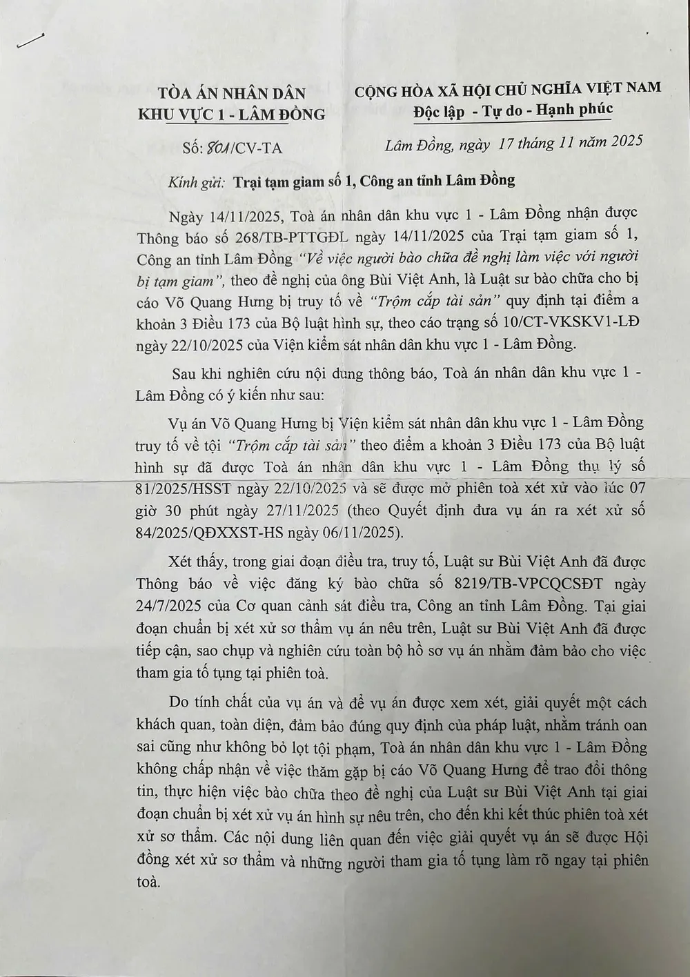 Theo nội dung văn bản, ngày 14-11-2025, TAND khu vực 1 - Lâm Đồng nhận được thông báo của Trại tạm giam số 1, Công an tỉnh Lâm Đồng về việc luật sư Bùi Việt Anh - người bào chữa cho bị cáo Võ Quang Hưng (đang bị truy tố, tạm giam về tội trộm cắp tài sản) đề nghị được làm việc với bị cáo trong trại tạm giam.