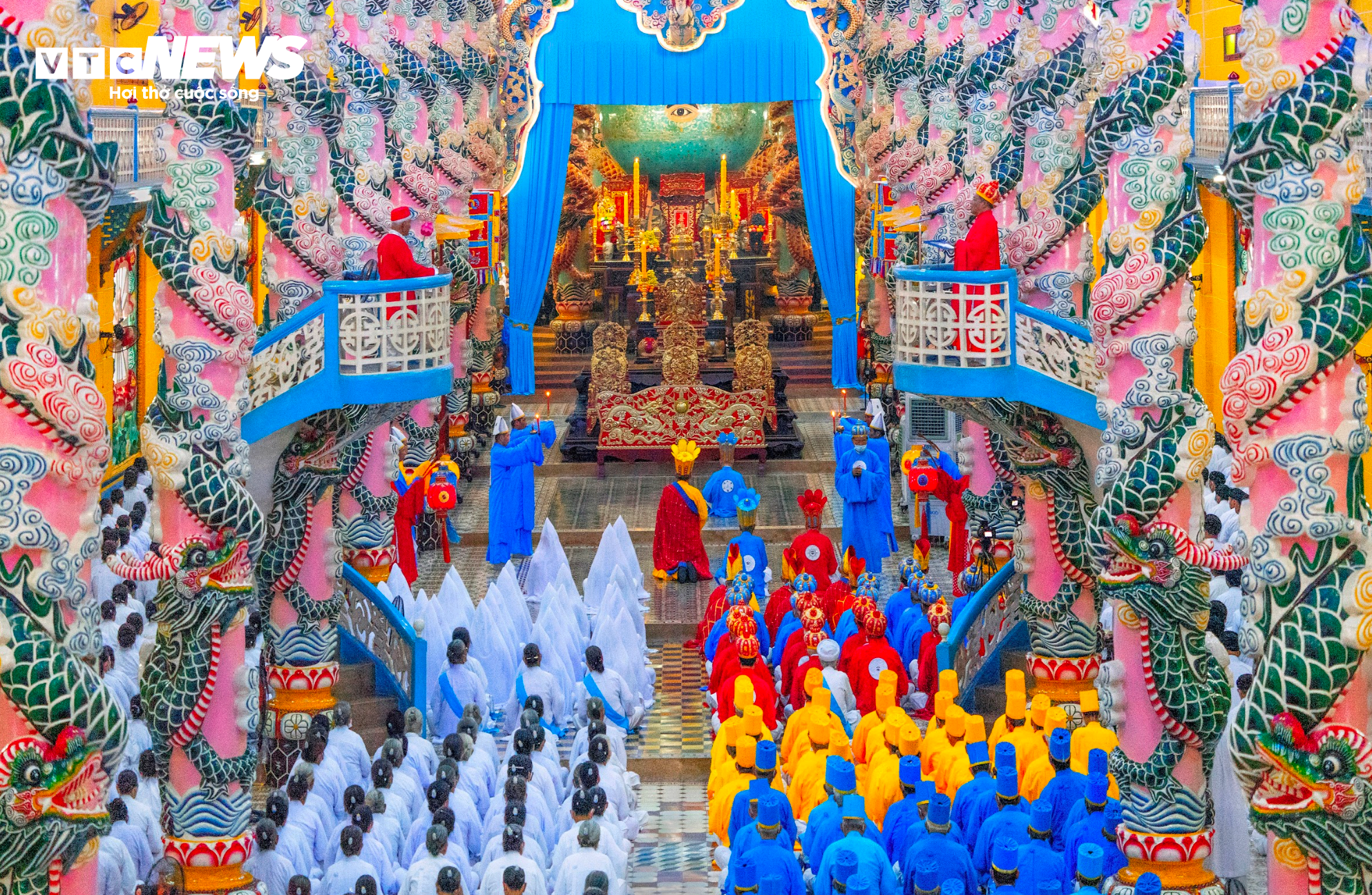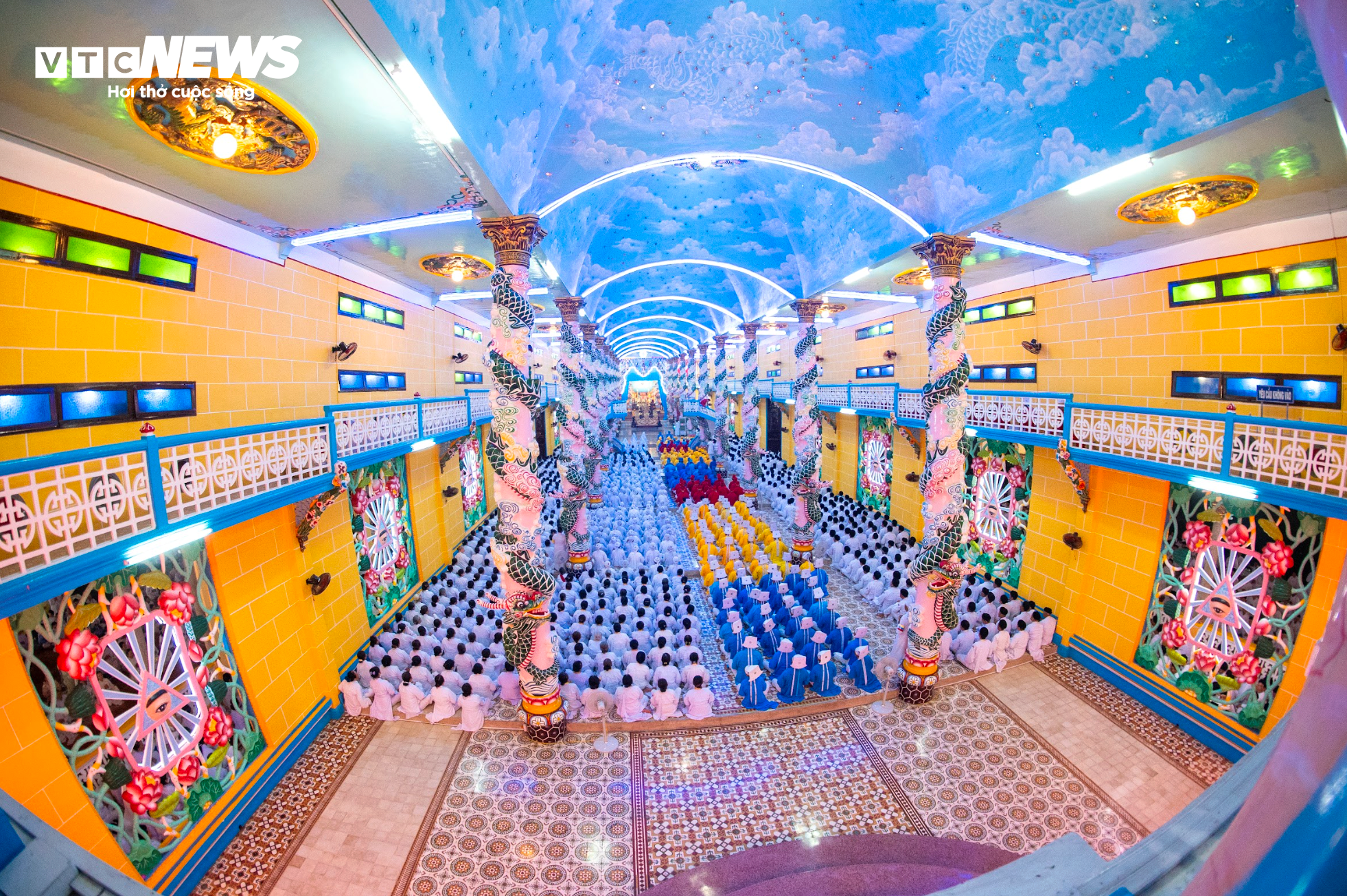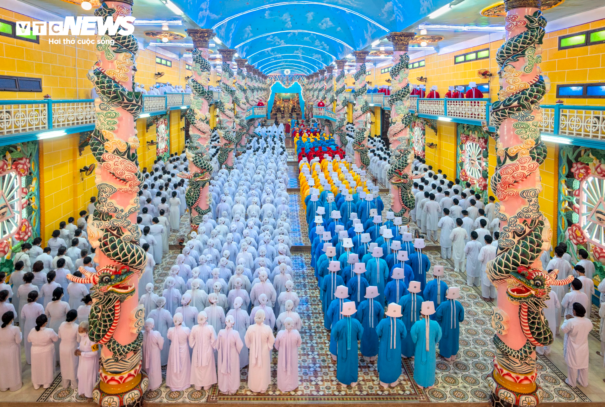 Nếu kiến trúc khiến người ta choáng ngợp thì đời sống nghi lễ lại khiến người ta lắng lại. Buổi trưa, khi ánh nắng đứng bóng trên sân gạch, tiếng chuông Ngọ vang lên, một thanh âm tròn đầy, đủ để nhắc cả khu vực xung quanh về một thời cúng quan trọng trong ngày. Tín đồ, từ già đến trẻ, bước đều vào nội điện. Họ mặc áo dài trắng, tay chắp trước ngực, di chuyển trong im lặng tuyệt đối. Cảm giác như đang xem một dòng chảy văn hóa chứ không phải nghi lễ đơn thuần.
