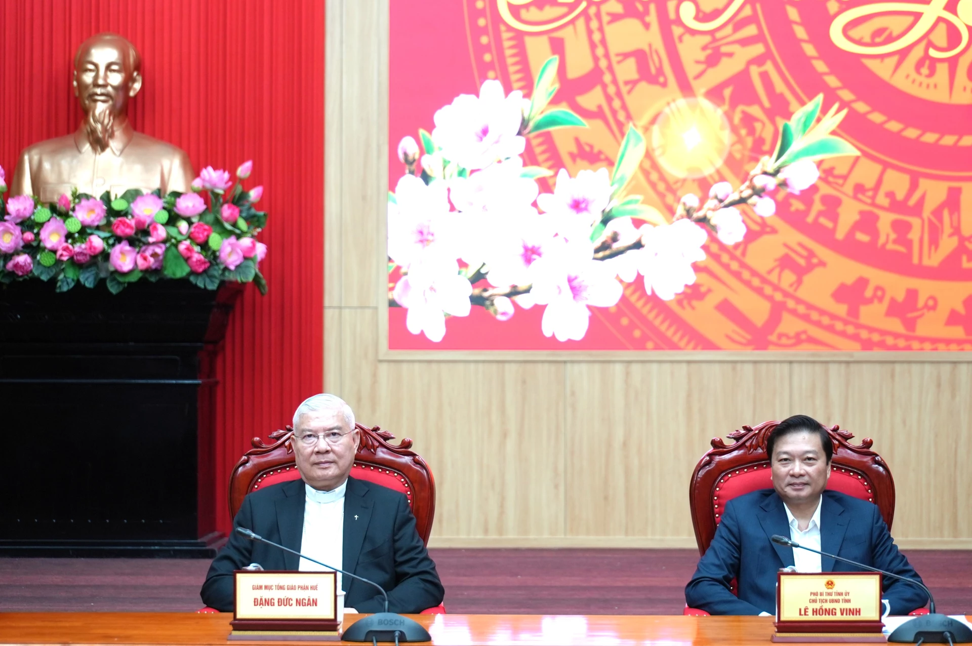 Đồng chí Lê Hồng Vinh, Chủ tịch UBND tỉnh mong muốn Tổng Giám mục Giuse Đặng Đức Ngân tiếp tục đồng hành cùng tỉnh trong hiện thực hóa mục tiêu tăng trưởng vì cuộc sống bình an, hạnh phúc của Nhân dân; hướng dẫn các linh mục, tu sĩ, bà con giáo dân sống tốt đời, đẹp đạo, củng cố khối đại đoàn kết toàn dân.