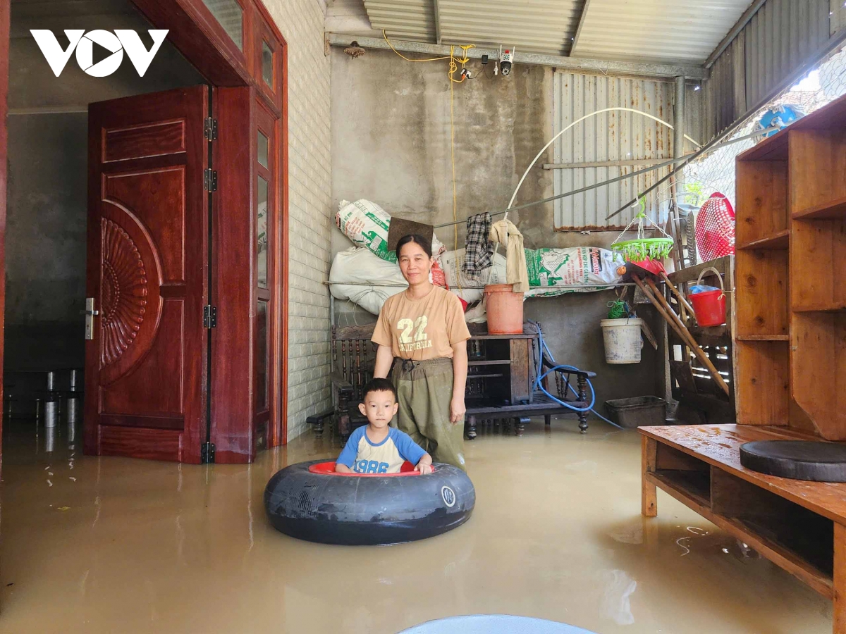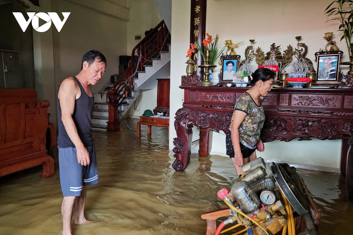 Bà Nguyễn Thị Phường, 63 tuổi, vợ ông Dõi kể, 3-4 ngày trước, thấy nước sông lên cao, mọi người hô nhau kê đồ vì năm ngoái nhiều nhà hỏng tivi, tủ lạnh, bếp điện vì ngấm nước. "Mấy chú công an, bộ đội cũng vào giúp, nhưng nước dâng nhanh quá, chỉ kịp kê cao đồ đạc. Mấy con ngan, con ngỗng bơi đi hết", bà Phường nghẹn ngào nói.