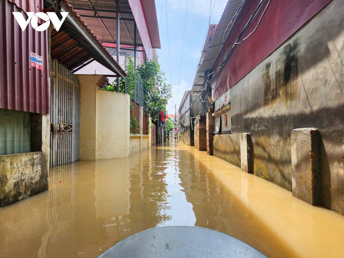 Nước sông Cầu dâng cao, khắp các con đường ngõ xóm của tổ dân phố Đông Tiến đều bị ngập sâu trong nước sông đục ngầu.