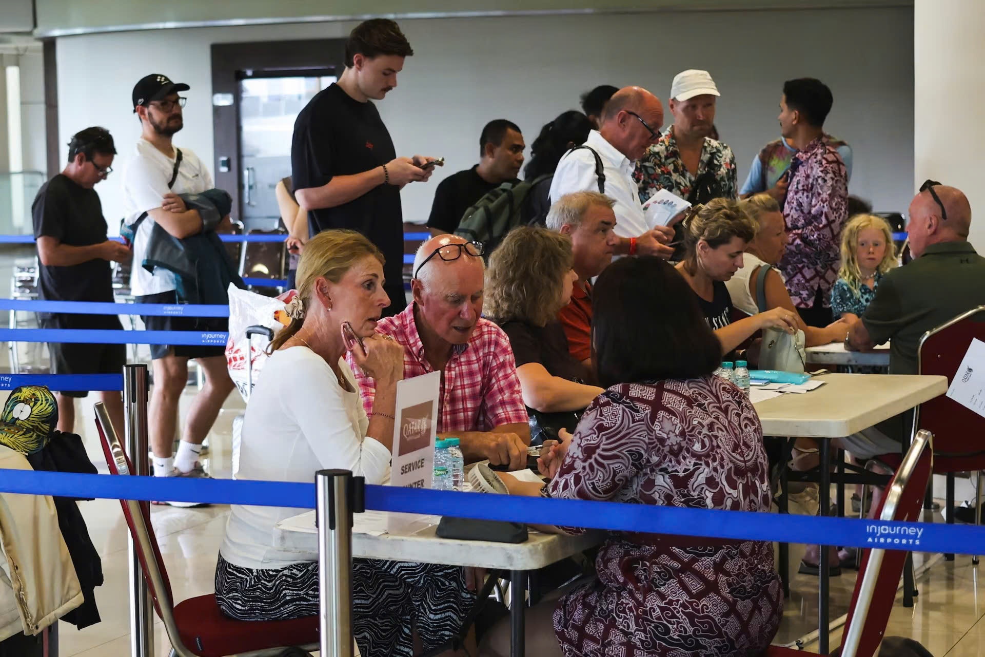 Hành khách trình báo với bộ phận chăm sóc khách hàng của Qatar Airways tại sân bay quốc tế I Gusti Ngurah Rai sau khi các chuyến bay đến Doha, Dubai và Abu Dhabi bị hủy bỏ, ngày 1/3. Ảnh: Reuters.
