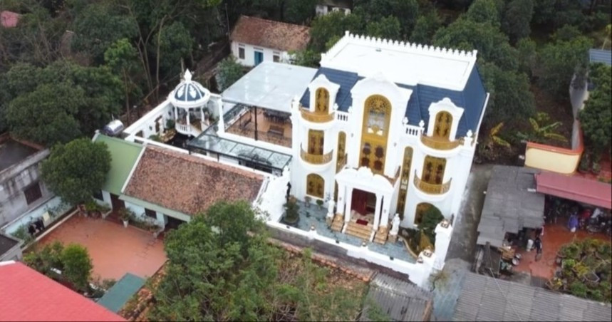 Tọa lạc giữa vùng quê thuộc khu vực huyện Tiên Du (cũ), Bắc Ninh, căn biệt thự dát vàng lộng lẫy nổi bật như một công trình châu Âu. Ảnh chụp màn hình NhaTo