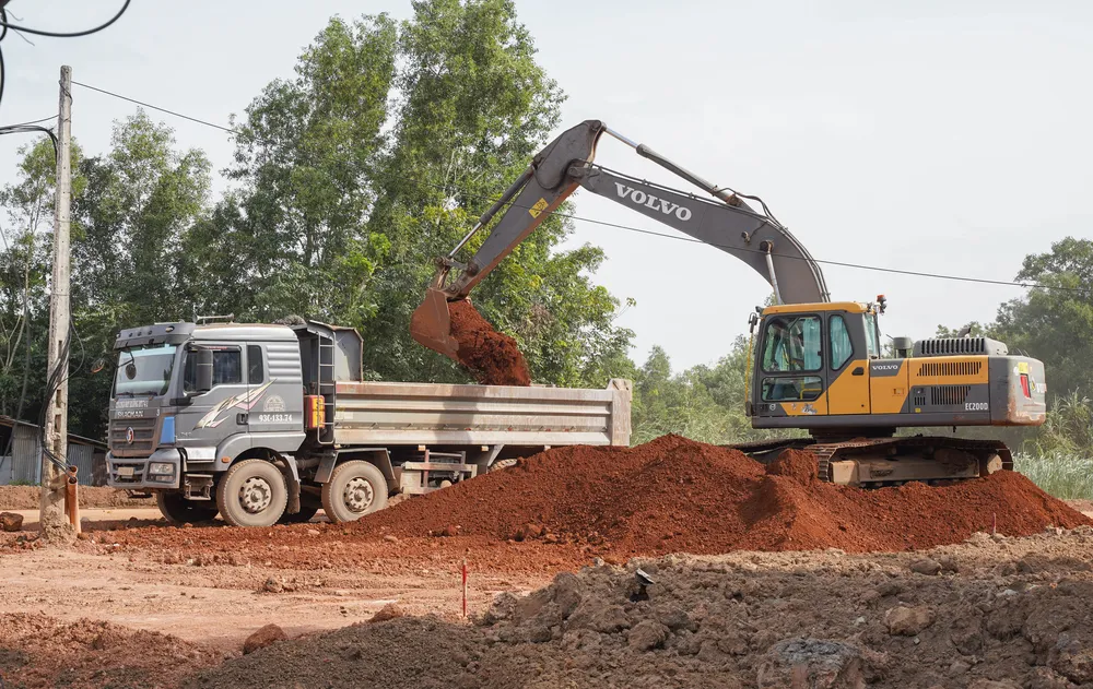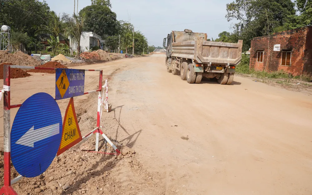 Phần đường dẫn cầu Thanh An phía tỉnh Tây Ninh vẫn dài khoảng 300m, máy xúc, xe vận tải tích cực làm việc.