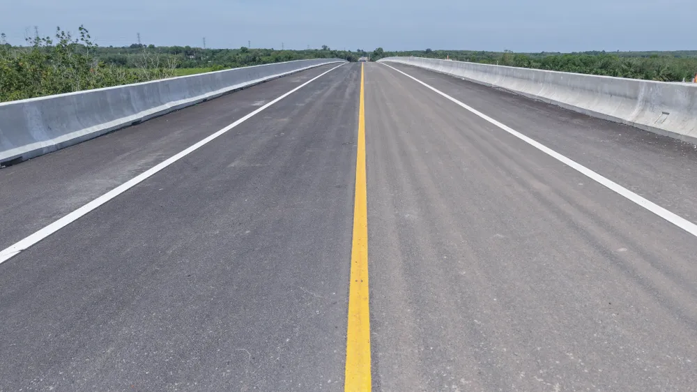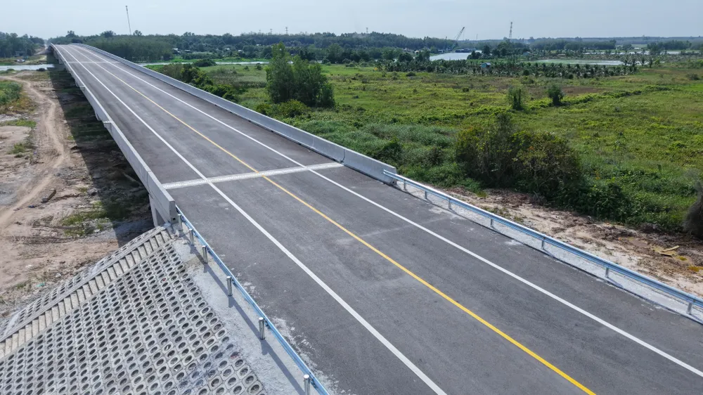 Phần đường dẫn lên cầu phía TP.HCM đã thảm nhựa, kẻ vạch chia làn đường, lắp dải phân cách.