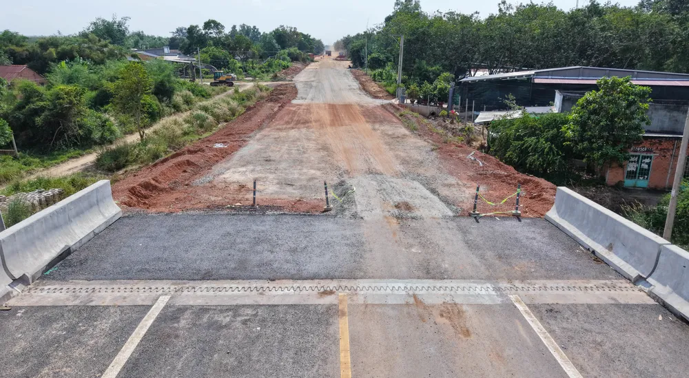 Phía TP.HCM, công nhân đang bê tông hóa cọc tiêu, kẻ vạch phân làn đường tại giao lộ đường Hồ Chí Minh - DT744 (đường dẫn lên cầu). Phía tỉnh Tây Ninh, máy xúc, xe tải tiếp tục san lấp mặt bằng, thi công phần đường dẫn từ giao lộ đường Hồ Chí Minh - DT789.
