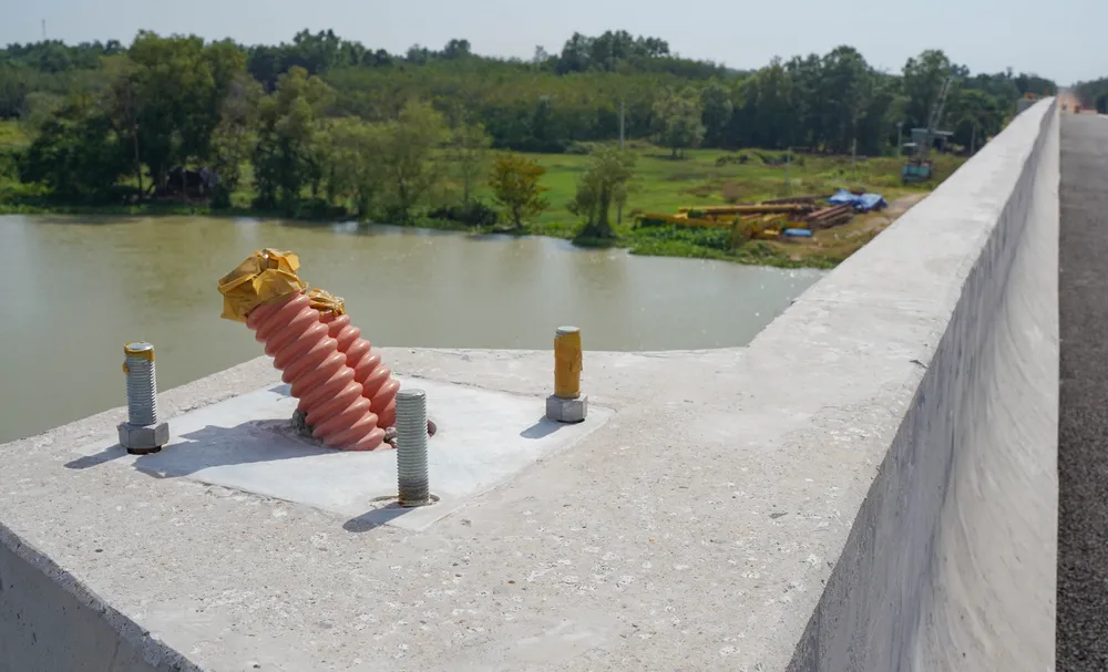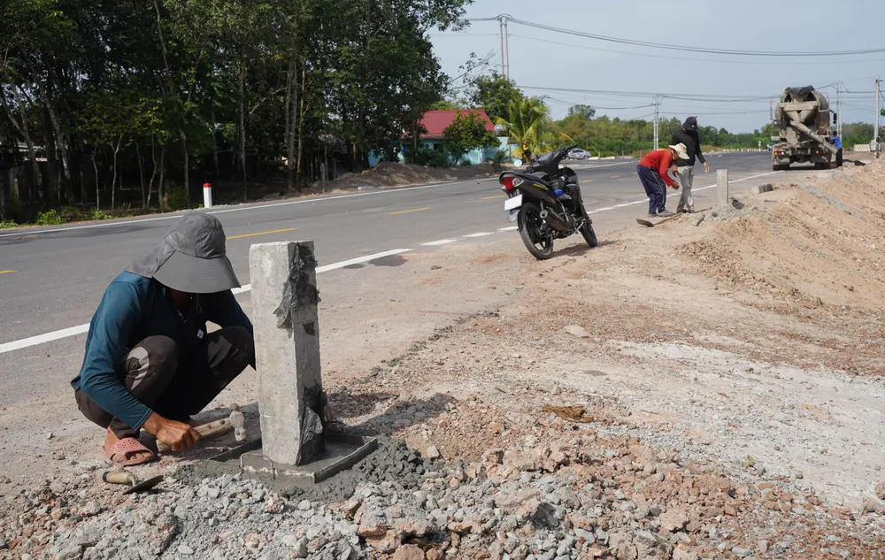 Công nhân tiếp tục thi cọc tiêu giao thông dọc hai bên đường dẫn lên cầu phía TP.HCM.