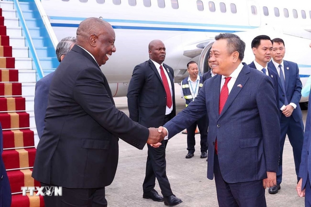 Ngày 23/10, Tổng thống Nam Phi Matamela Cyril Ramaphosa đến Hà Nội, bắt đầu thăm cấp Nhà nước tới Việt Nam từ ngày 23-24/10, theo lời mời của Chủ tịch nước Lương Cường. Đây là chuyến thăm Việt Nam đầu tiên của một Tổng thống Nam Phi sau gần 20 năm. (Ảnh: TTXVN)