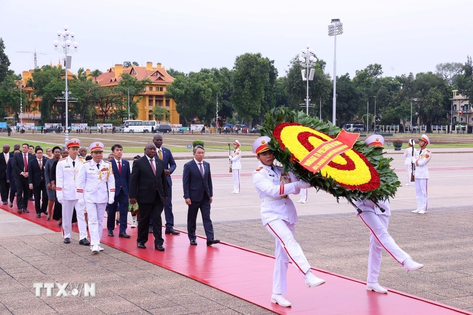 Chiều 23/10, Tổng thống Nam Phi Matamela Cyril Ramaphosa đến đặt vòng hoa, vào Lăng viếng Chủ tịch Hồ Chí Minh và dâng hương, tưởng niệm các Anh hùng liệt sĩ tại Ðài tưởng niệm các Anh hùng liệt sĩ trên đường Bắc Sơn, Hà Nội. (Ảnh: TTXVN)