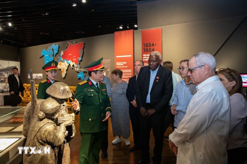 Ngày 5/10, Chủ tịch Quốc hội Cuba Esteban Lazo Hernández và đoàn đại biểu cấp cao Cuba đã tham quan Bảo tàng Lịch sử Quân sự Việt Nam. Tại đây, Chủ tịch Quốc hội Cuba cùng Đoàn đã đặt hoa tại cụm tượng tri ân chuyên gia quân sự Cuba. (Ảnh: TTXVN)