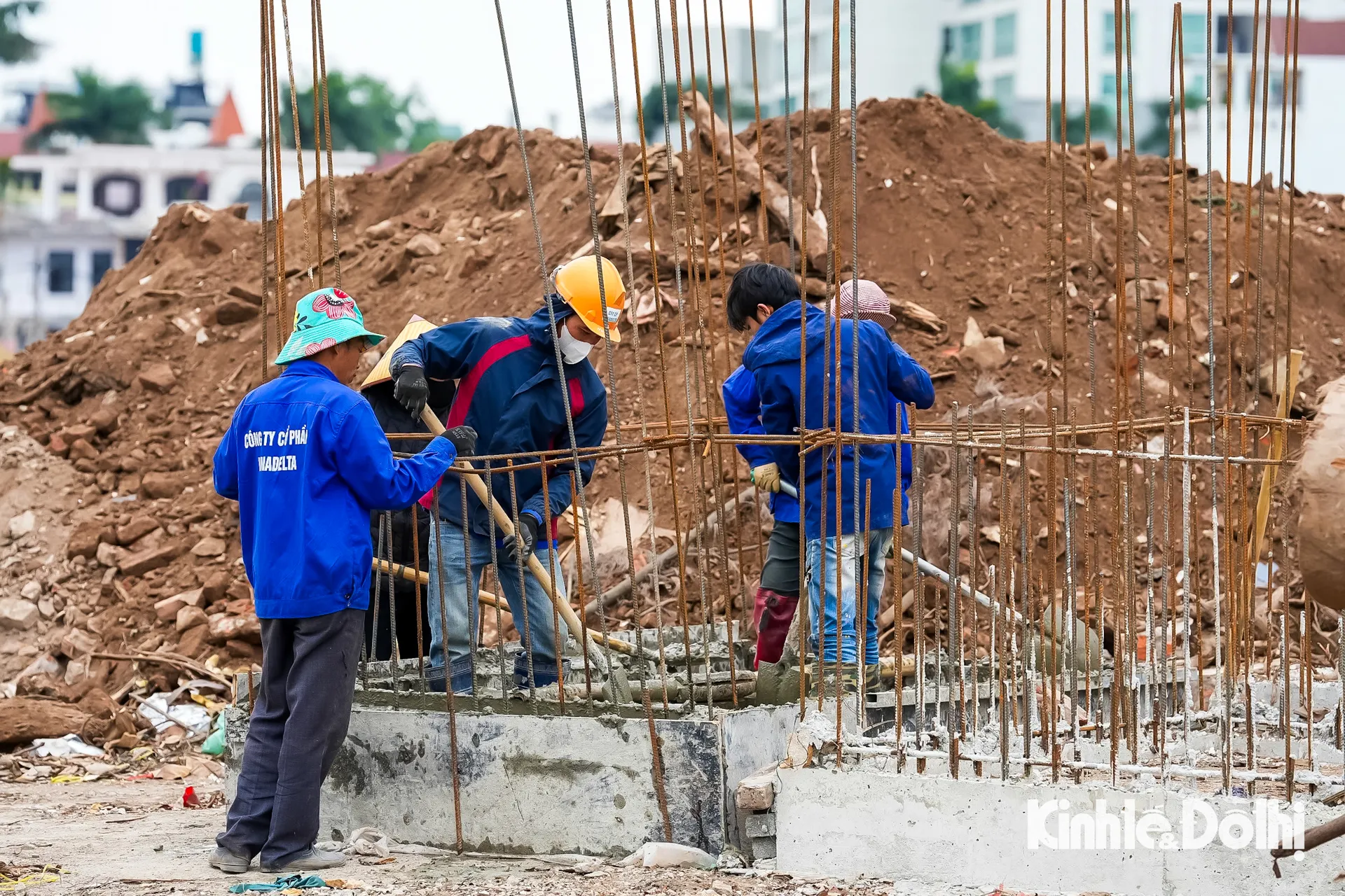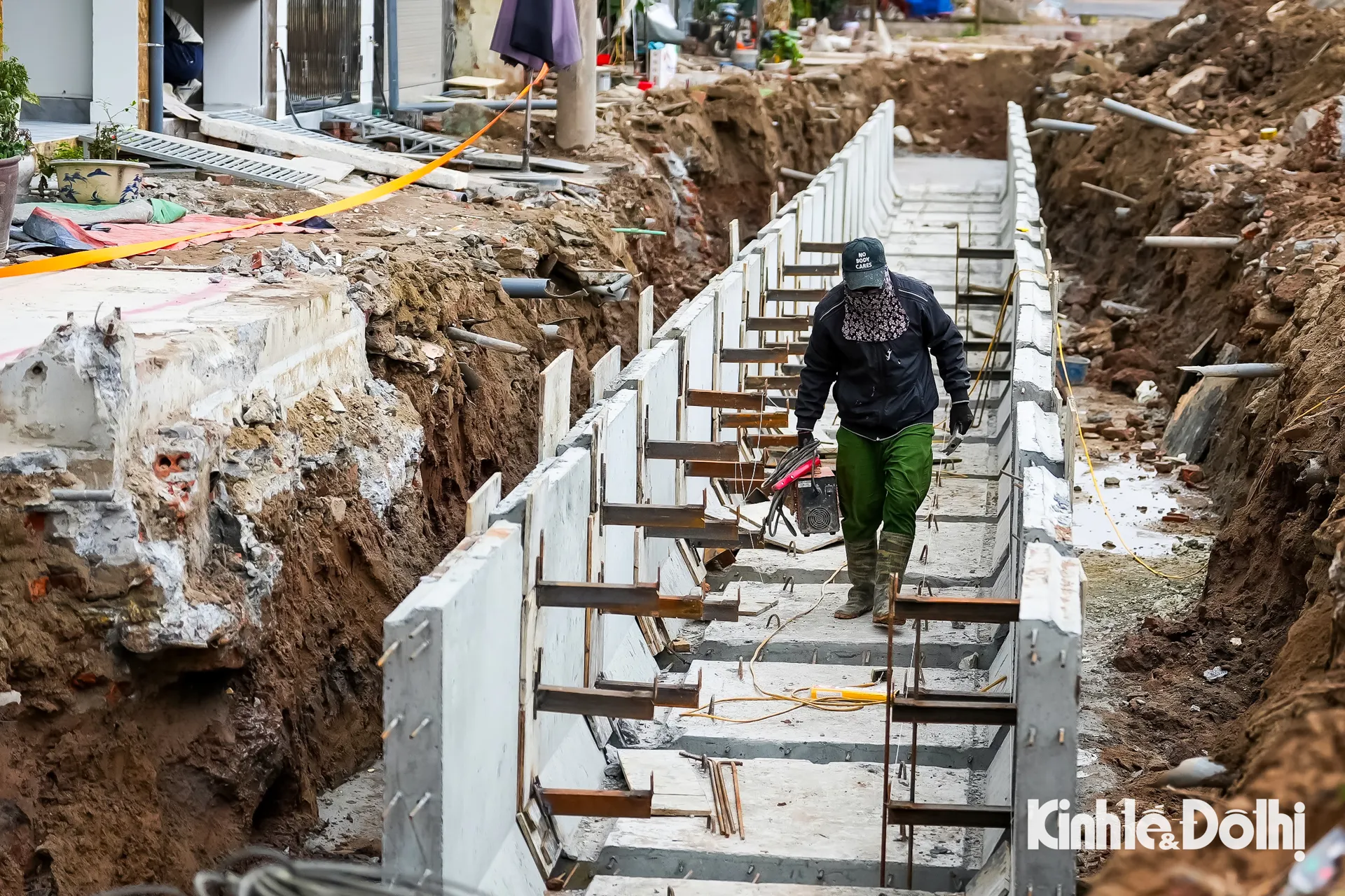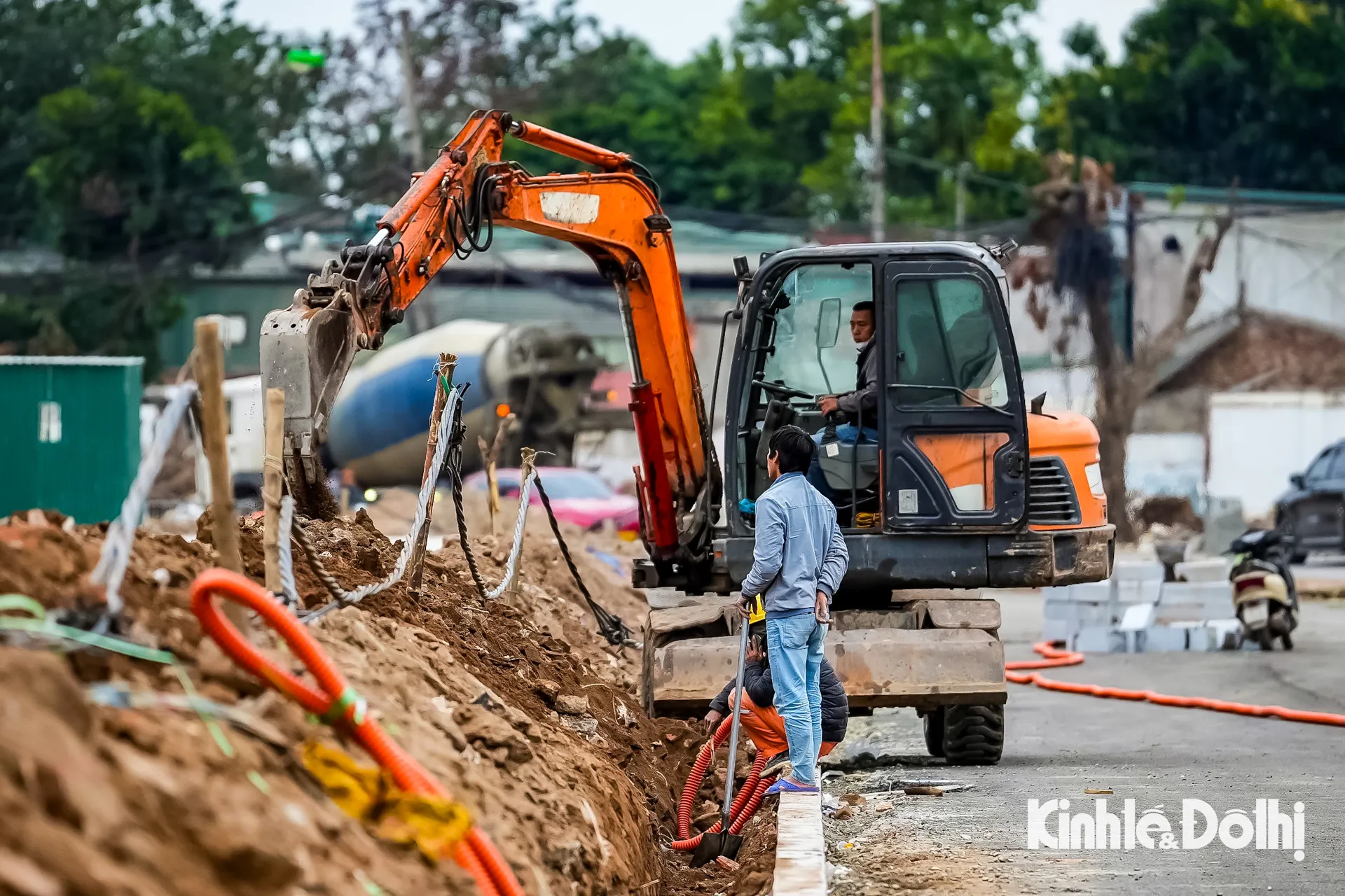 Công nhân thi công hệ thống hạ tầng kỹ thuật dọc tuyến đường Đặng Thai Mai.