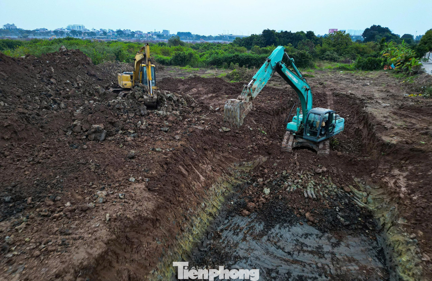 Thời điểm hiện tại, máy móc, nhân lực của nhà thầu đang triển khai dọn dẹp mặt bằng, đào hồ…