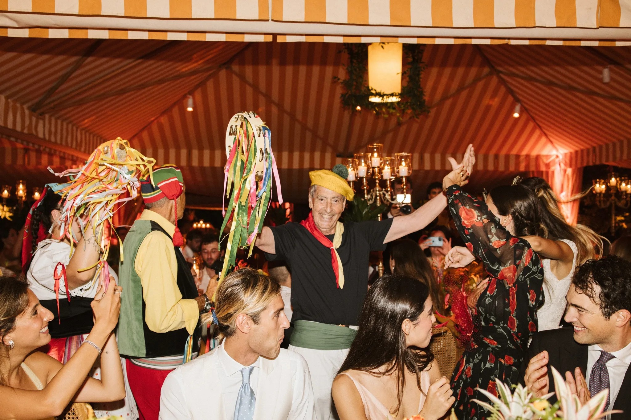 Bàn tiệc bày bộ đĩa in huy hiệu gia đình, khăn trải từ các xưởng lụa Bourbon cổ ở San Leucio và những chi tiết thêu thủ công từ Marcellinara. Giữa những ly Branca Menta, các điệu nhảy ngẫu hứng và tiếng cười rộn rã, chiếc bánh cưới được mang ra, đặt trên một chậu đồng cổ của gia đình.