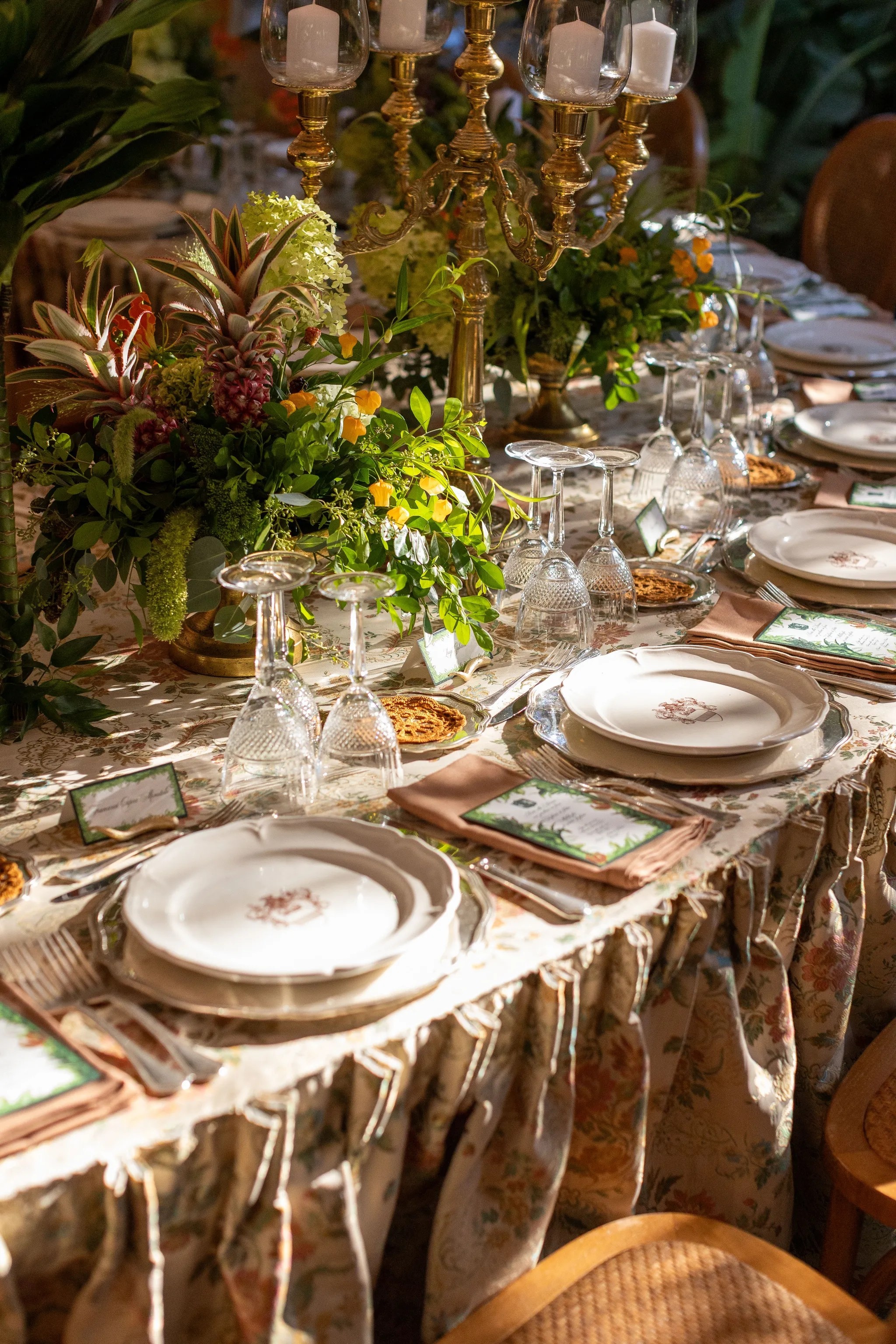 Khách được phát quạt vải và thưởng thức món ăn từ các quầy chế biến trực tiếp, phục vụ trên những khay bạc cặp đôi đã mua trong chuyến đi tới Marrakesh (Morocco). Buổi tiệc trưa được tổ chức trên khu đất hình vòng tròn của biệt thự, dưới một mái che lớn với ba bàn chữ U dành cho 400 khách.