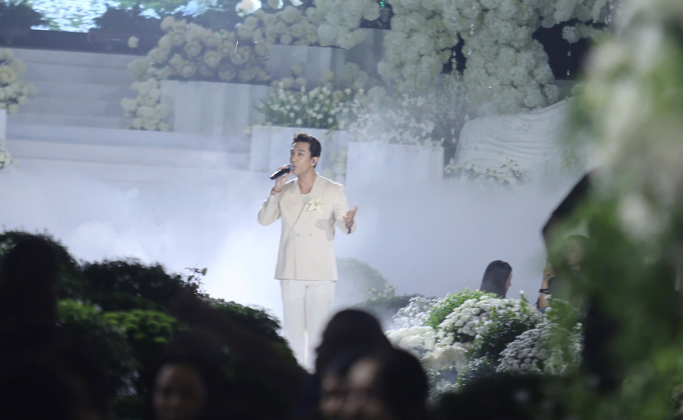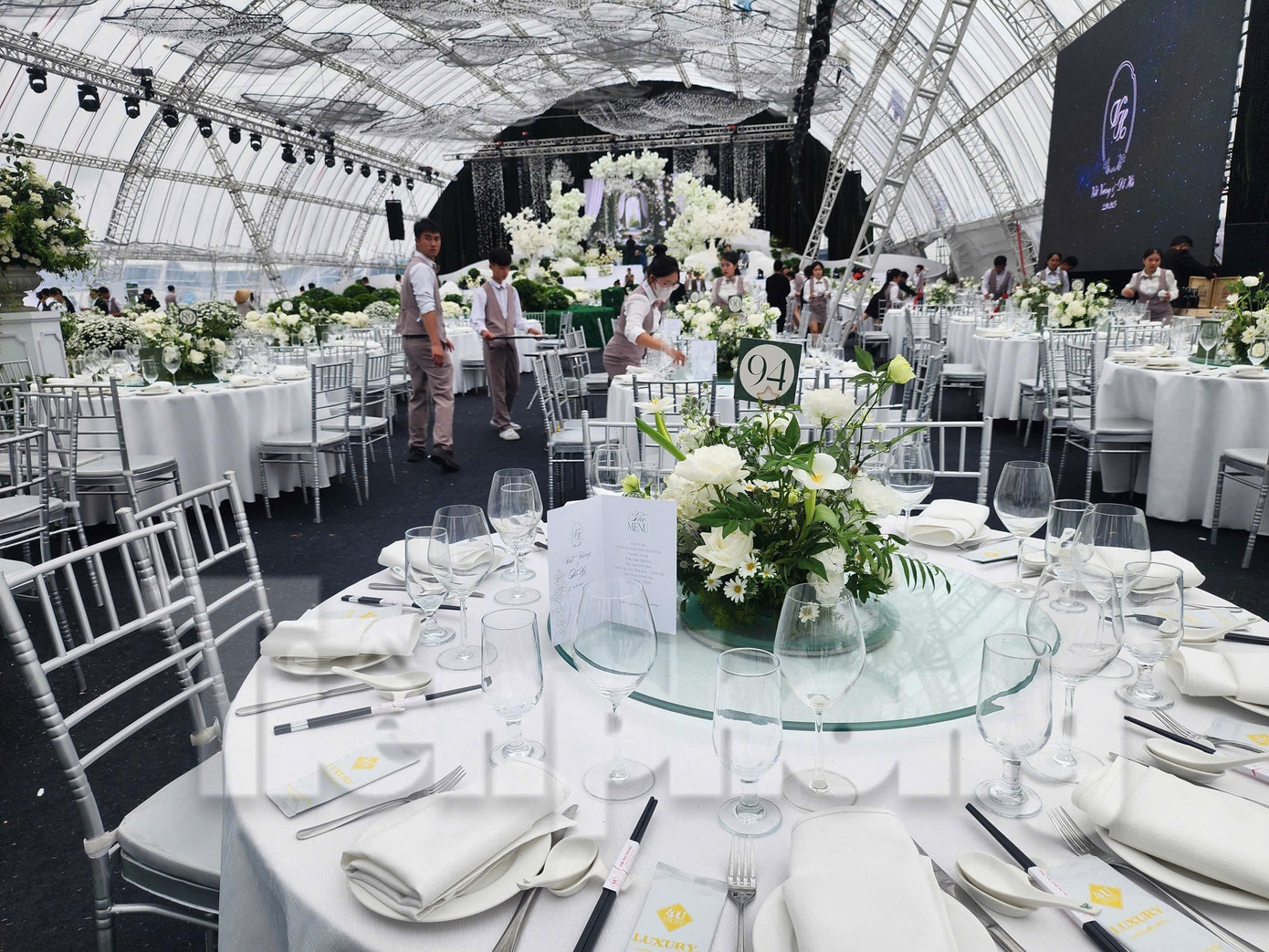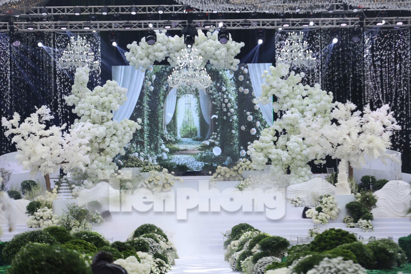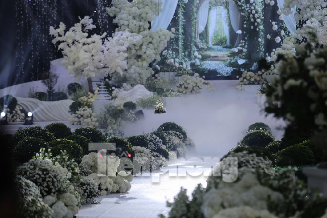 Đám cưới được tổ chức trên diện tích 3.000 m², trang trí toàn bộ bằng hoa tươi theo phong cách châu Âu. Sân khấu phủ hàng nghìn bông hoa trắng như cẩm tú cầu, lan, baby, hồng… kết nối bằng vòm hoa khổng lồ. Phía sau là màn hình LED trình chiếu hình ảnh lãng mạn của cô dâu chú rể.