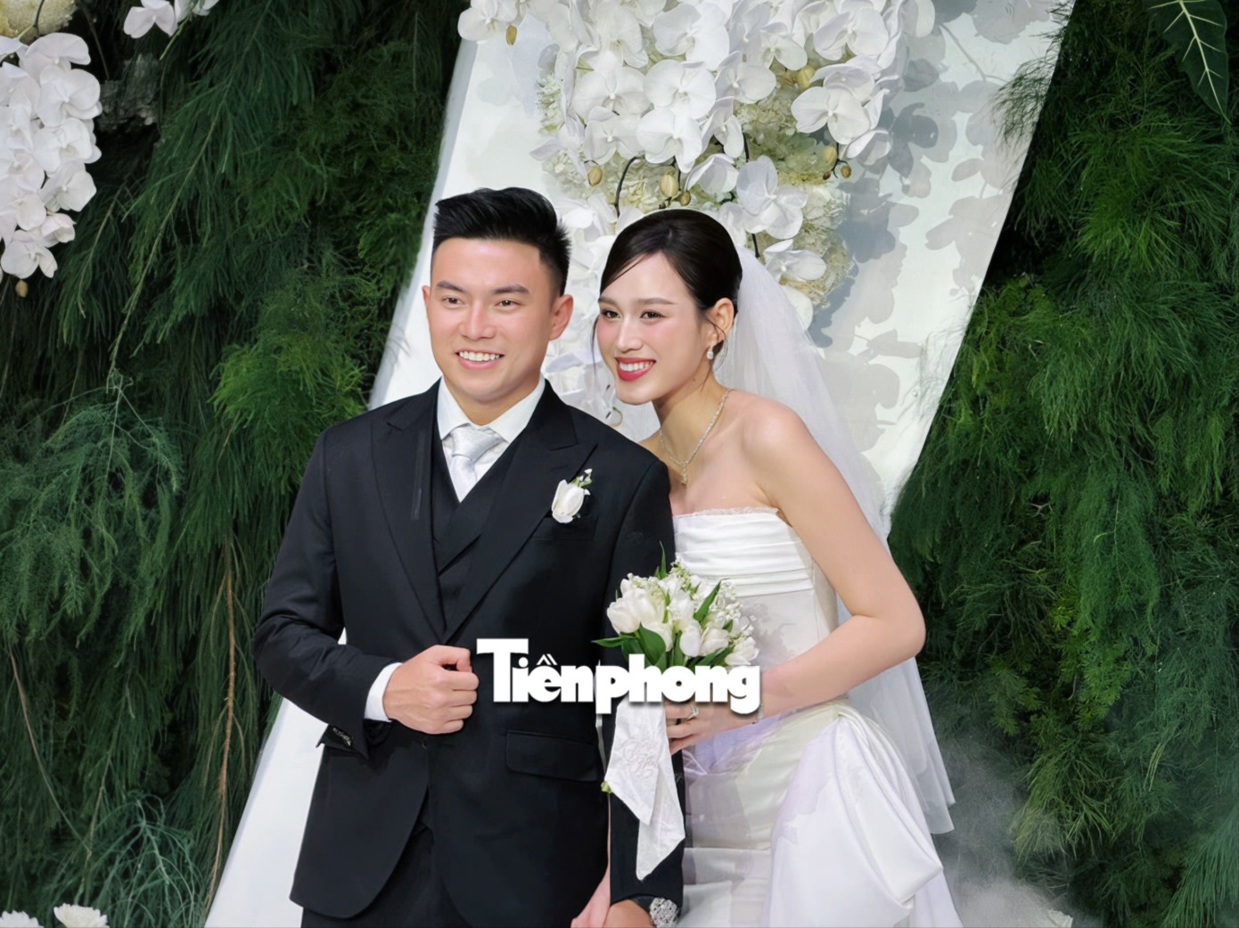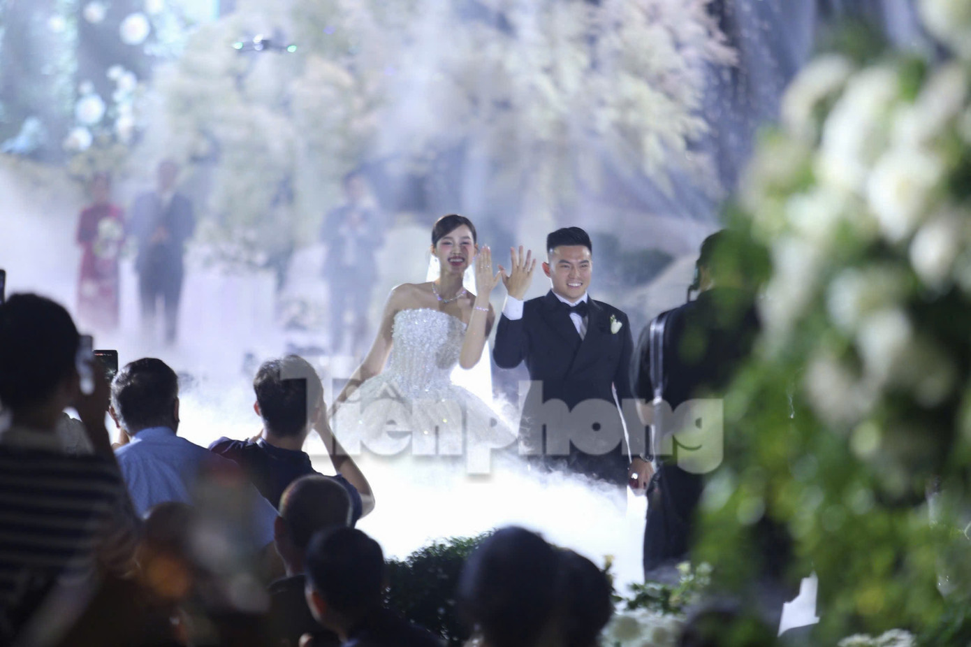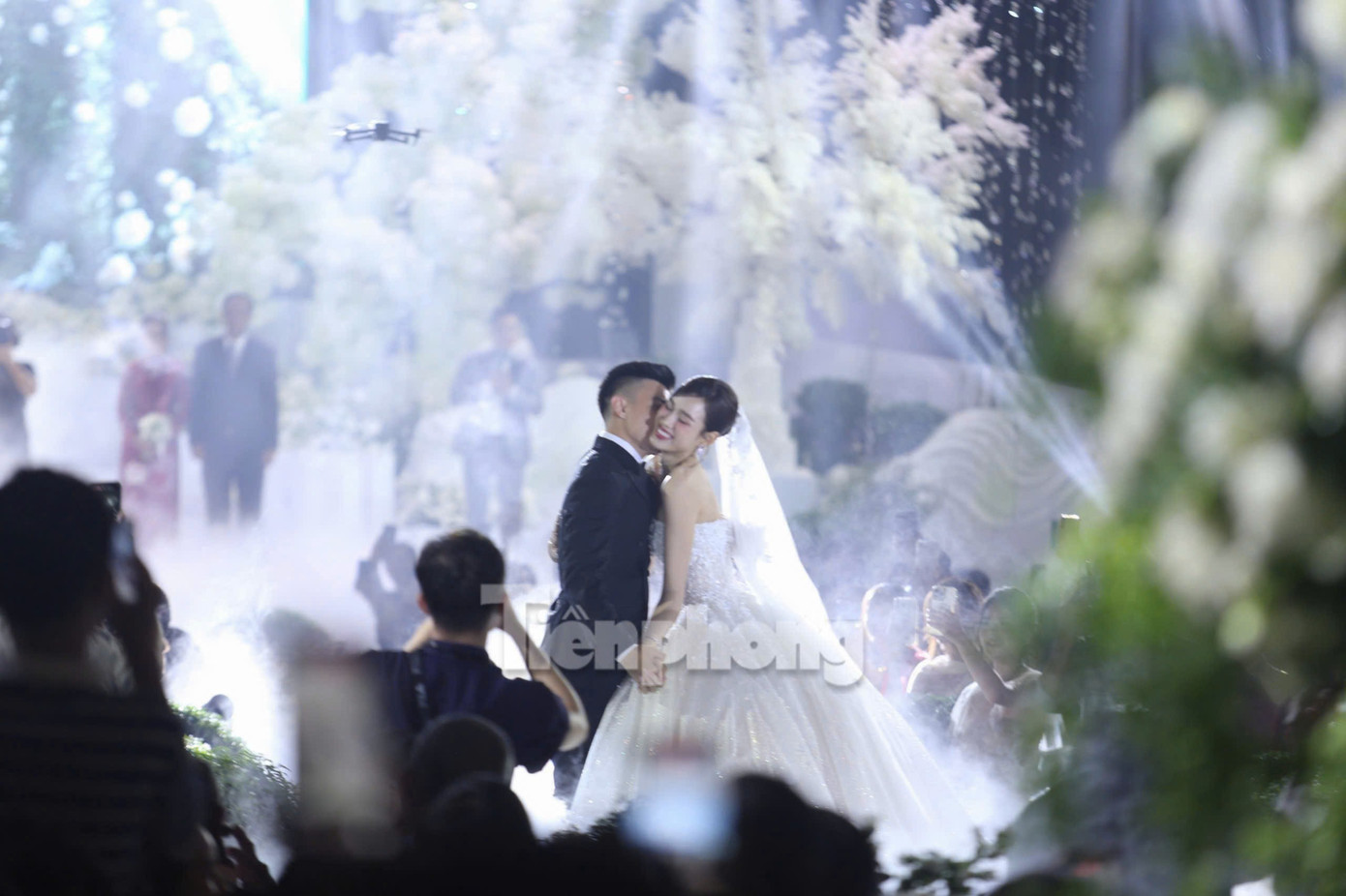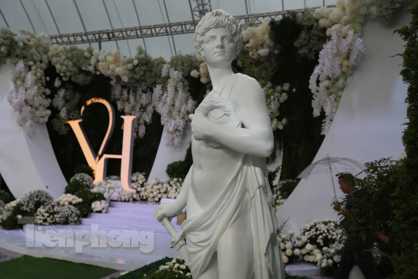 Đám cưới được tổ chức trên diện tích 3.000 m², trang trí toàn bộ bằng hoa tươi theo phong cách châu Âu. Sân khấu phủ hàng nghìn bông hoa trắng như cẩm tú cầu, lan, baby, hồng… kết nối bằng vòm hoa khổng lồ. Phía sau là màn hình LED trình chiếu hình ảnh lãng mạn của cô dâu chú rể.