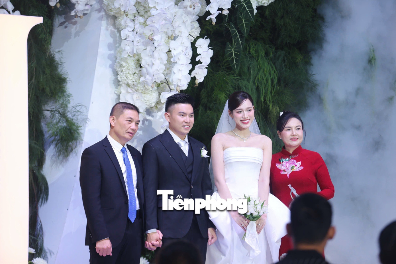Đỗ Hà chọn váy cưới cúp ngực, khoe vai trần, còn Viết Vương diện vest sáng màu. Hai bên thông gia cùng cô dâu chú rể chụp ảnh trước giờ đón khách.