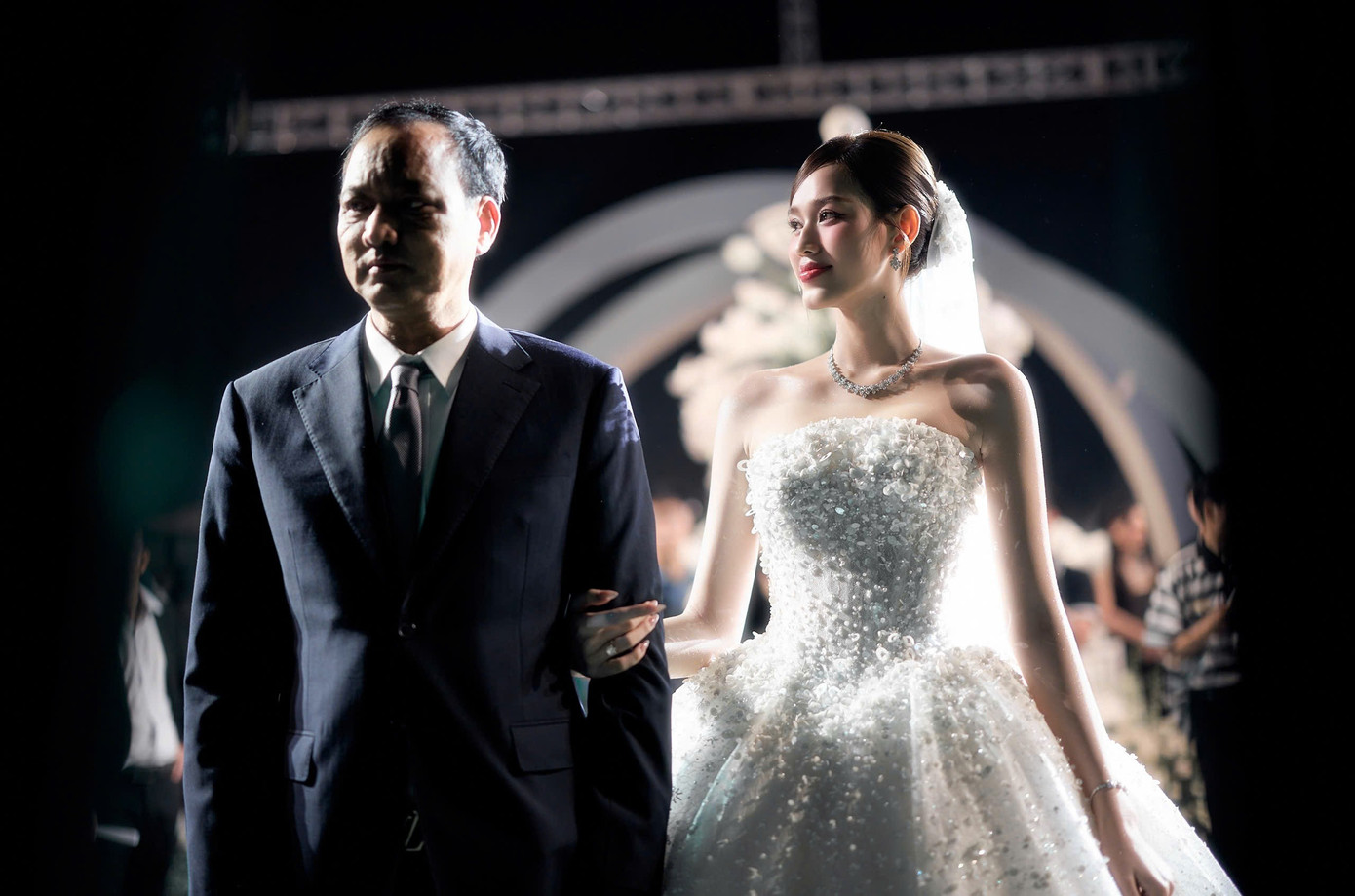 Phần mái che rạp cưới trong suốt, vì thế có thể thấy được khung cảnh mưa. Bố cô dâu - ông Đỗ Văn Tào - dắt con gái bước vào lễ đường trên nền ca khúc Một đời của 14 Casper - Bon Nghiêm - buitruonglinh. Đỗ Hà xúc động, nắm tay bố tiến về phía chú rể giữa tiếng vỗ tay của quan khách.