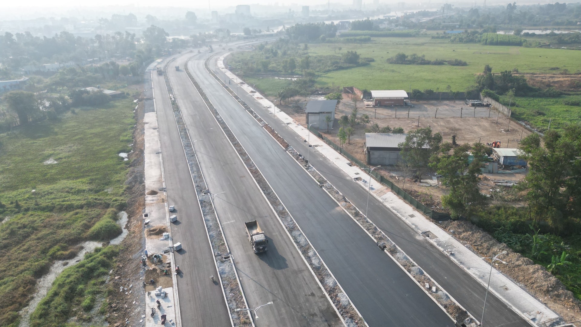 Ngoài việc trải thảm nhựa ra thì các hạng mục phụ trợ như lan can, hệ thống chiếu sáng, dải phân cách... đang được triển khai đồng loạt.