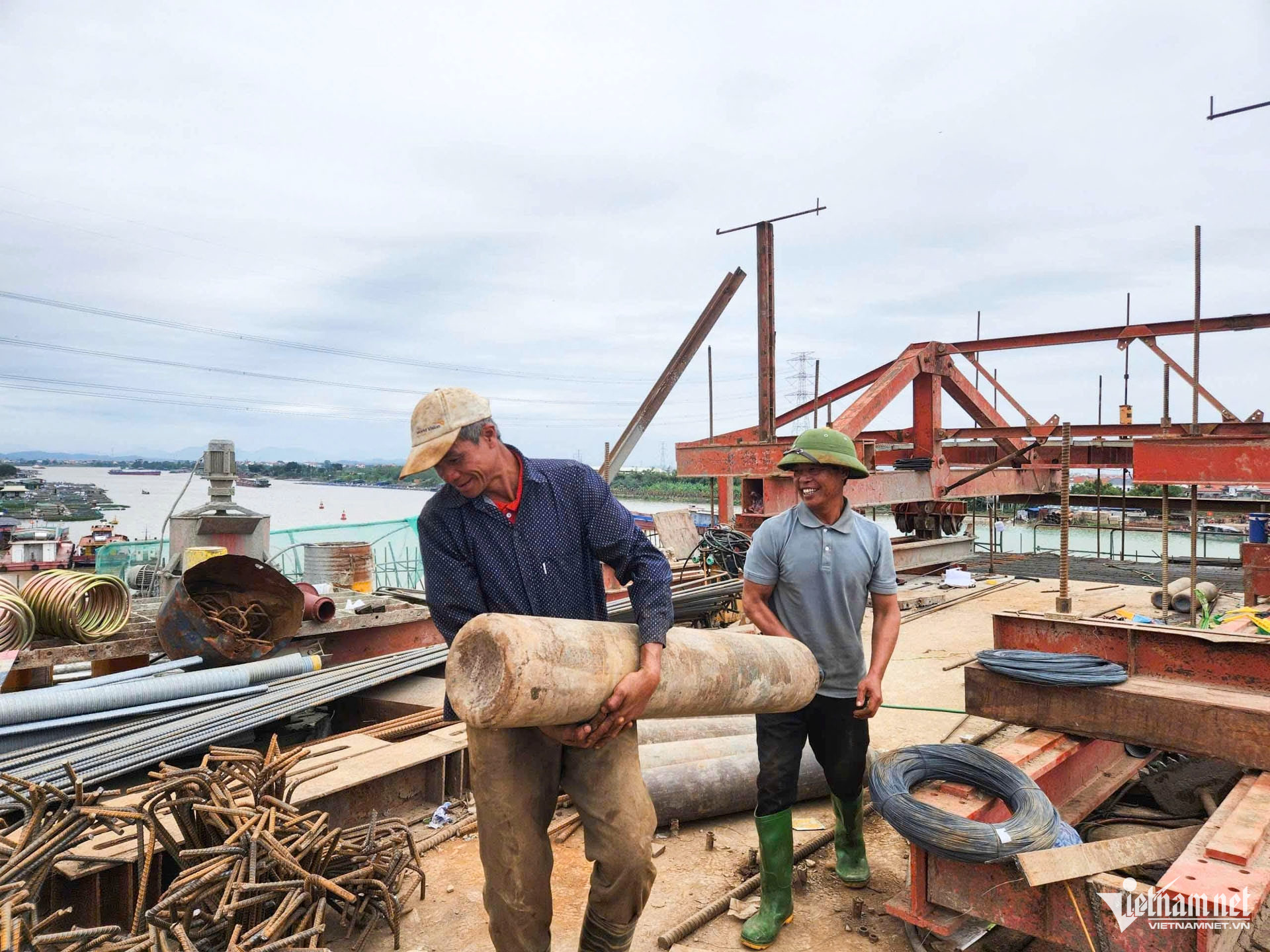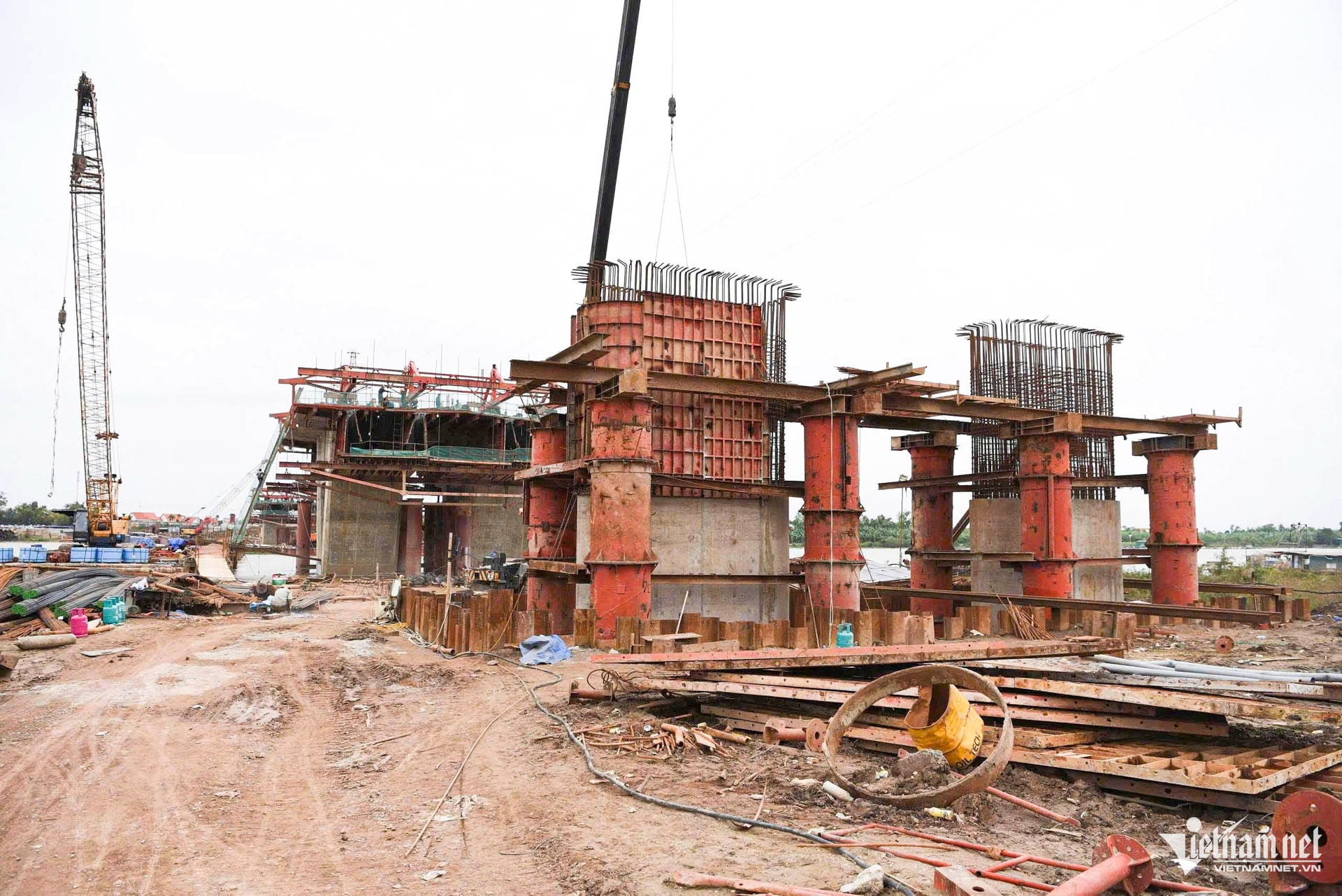 Theo ghi nhận của PV VietNamNet, những ngày này, trên công trường dự án đầu tư xây dựng cầu Kênh Vàng và đường dẫn hai đầu cầu nhộn nhịp công nhân, nhiều thiết bị máy móc đang được trưng dụng để đẩy nhanh tiến độ.