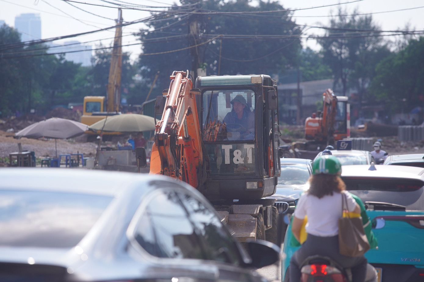 Hàng loạt xe cẩu, máy móc, nhân công được huy động để thực hiện công tác GPMB.