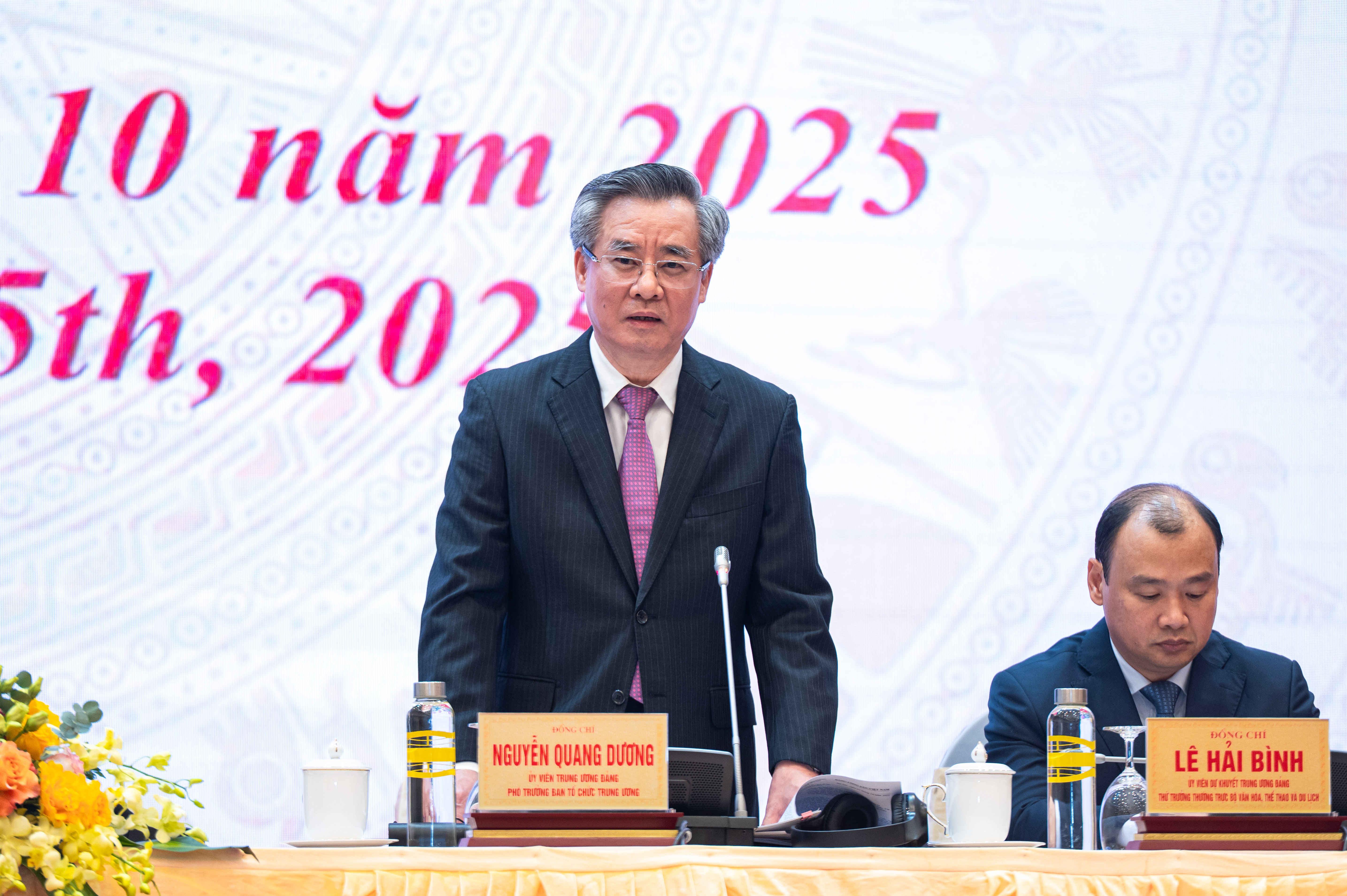 Chủ trì họp báo có ông Lại Xuân Môn (Phó trưởng ban Thường trực Ban Tuyên giáo và Dân vận Trung ương); bà Lâm Thị Phương Thanh (Phó chánh văn phòng Thường trực Văn phòng Trung ương Đảng); ông Nguyễn Quang Dương (Phó trưởng ban Tổ chức Trung ương); ông Lê Hải Bình (Thứ trưởng Thường trực Bộ Văn hóa, Thể thao và Du lịch); ông Tạ Ngọc Tấn (Phó chủ tịch Thường trực Hội đồng Lý luận Trung ương, Tổ phó thường trực Tổ Biên tập Văn kiện Đại hội XIV) và nhiều lãnh đạo các đơn vị khác.