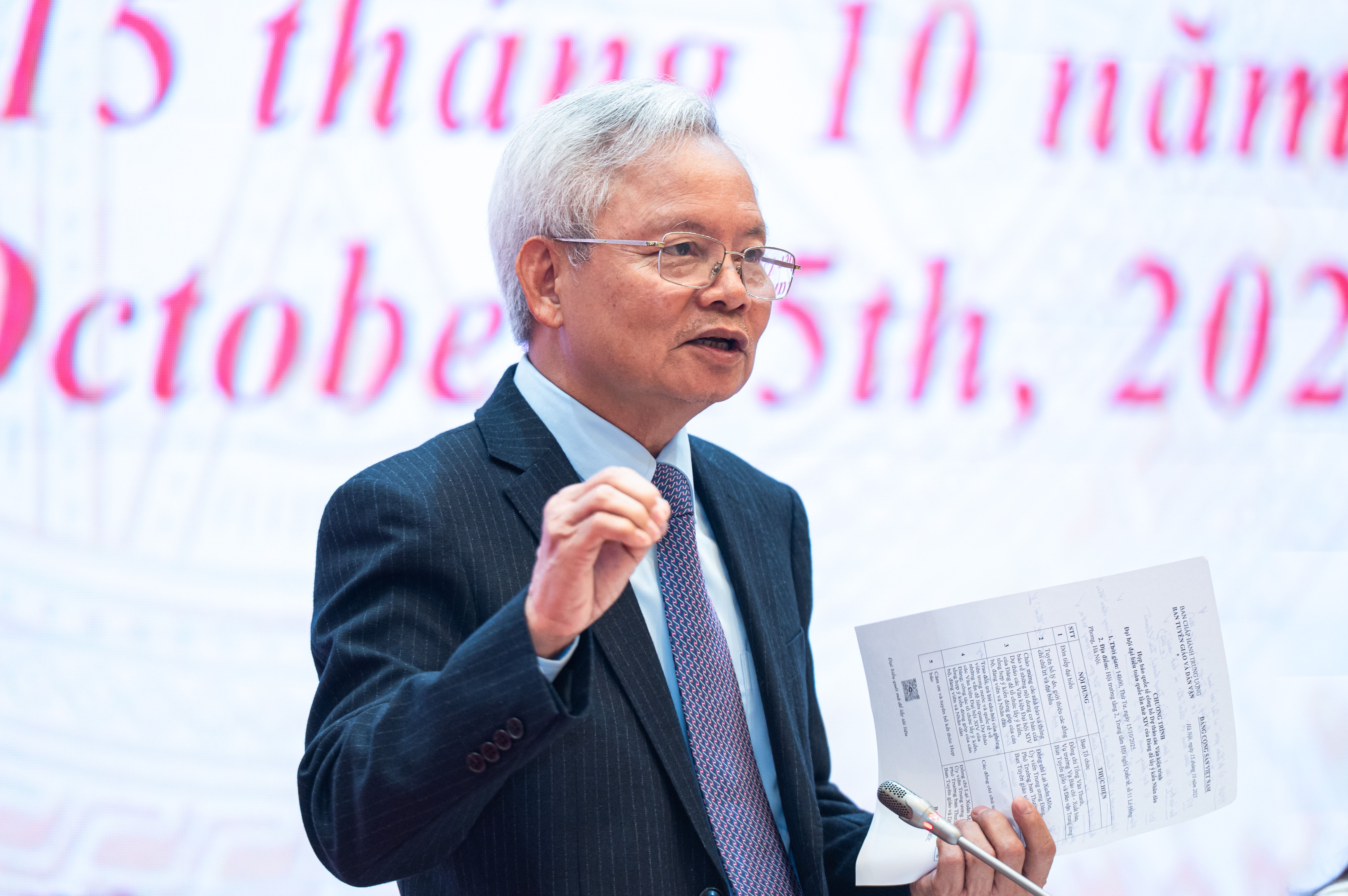 Giáo sư Tạ Ngọc Tấn (Phó chủ tịch Thường trực Hội đồng Lý luận Trung ương) khi trả lời câu hỏi tại buổi họp báo.
