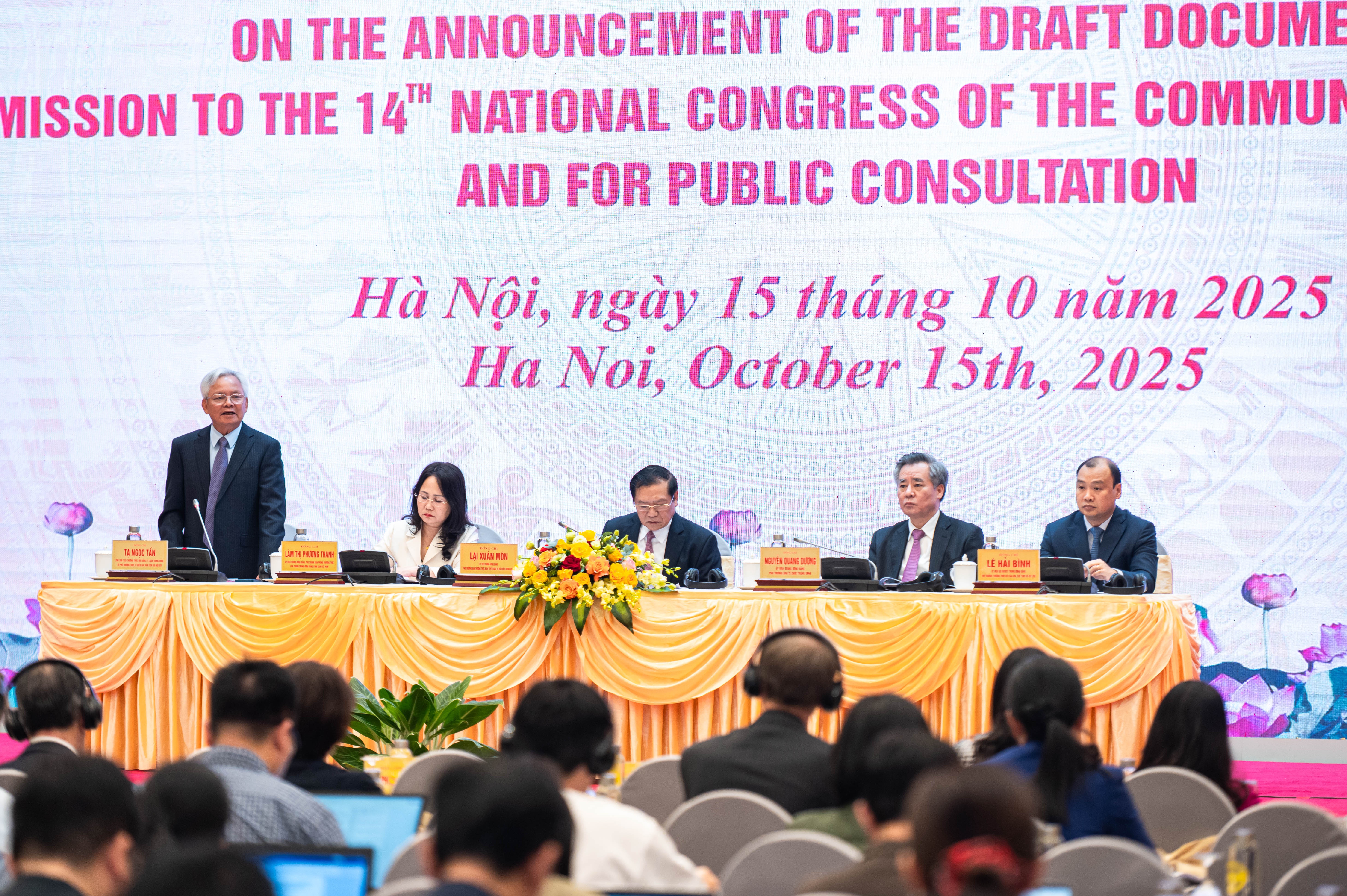 Chiều 15/10, buổi Họp báo quốc tế công bố Dự thảo các văn kiện trình Đại hội đại biểu toàn quốc lần thứ XIV của Đảng để lấy ý kiến cán bộ, đảng viên và Nhân dân diễn ra tại Hà Nội. Sự kiện do Ban Tuyên giáo và Dân vận Trung ương phối hợp với các cơ quan chức năng tổ chức.