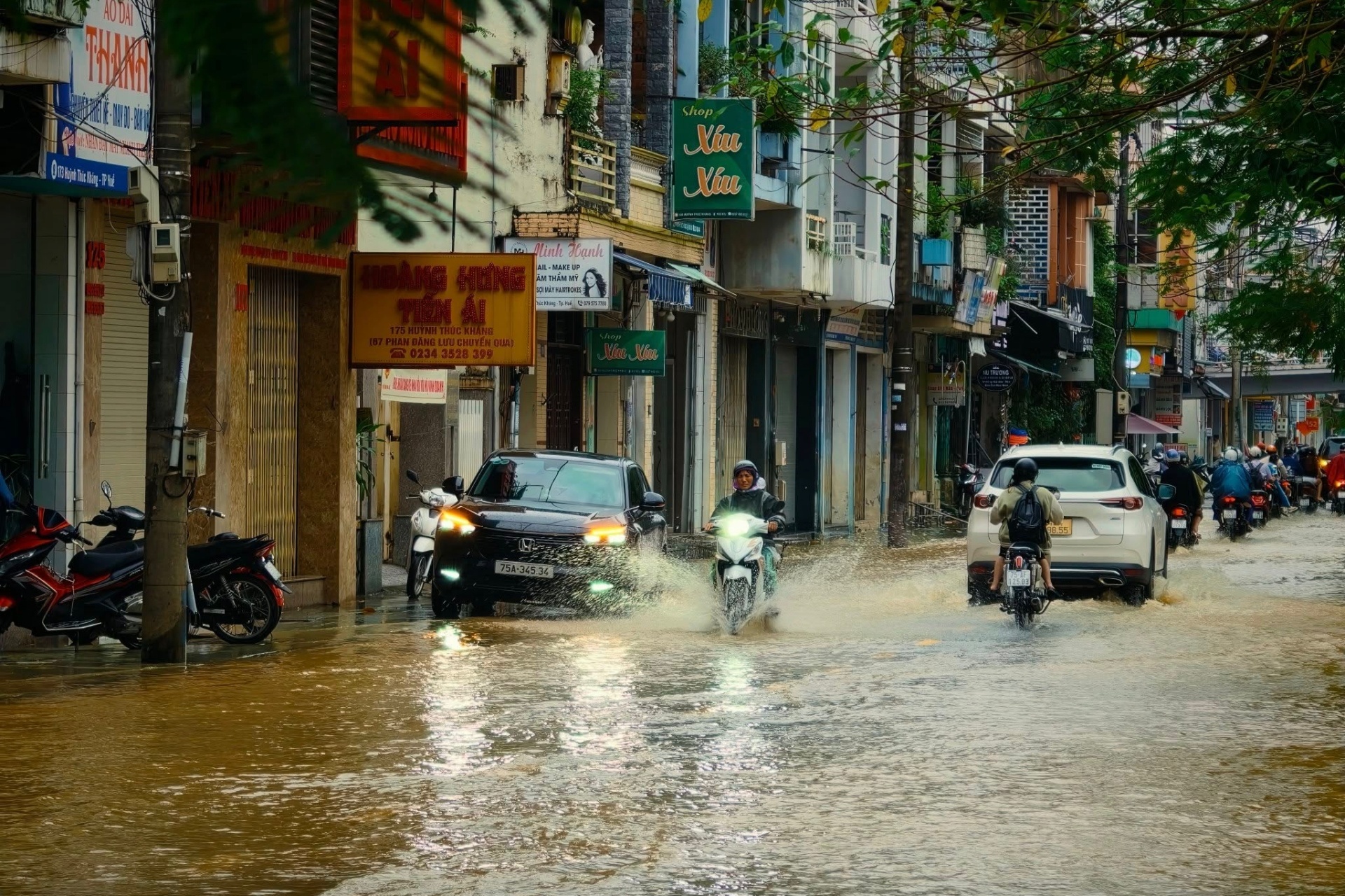 Nhân viên văn phòng, người lao động vật vã về nhà sau trận mưa sáng 17/11. Hình ảnh chụp đường Huỳnh Thúc Kháng trong biển nước lúc 13h cùng ngày. Ảnh: Kelvin Long.