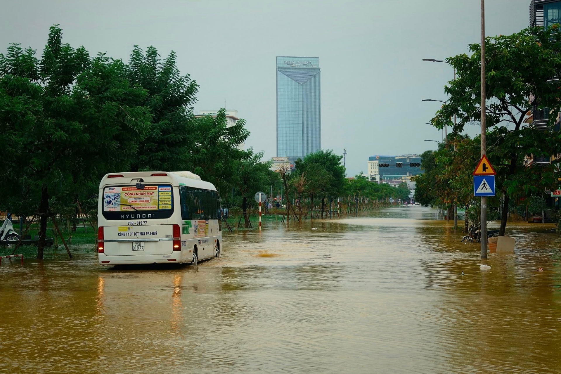 Các tuyến đường trũng ở Huế như Lê Quý Đôn, vòng xuyến Hùng Vương tiếp tục ngập sâu. Trời tạnh mưa vào ban trưa như "khoảng nghỉ" để người dân mua sắm, chuẩn bị lương thực cho những ngày mưa lớn sắp tới. Hình ảnh chụp công viên bờ Hồ lúc 13h ngày 17/11. Ảnh: Kelvin Long.